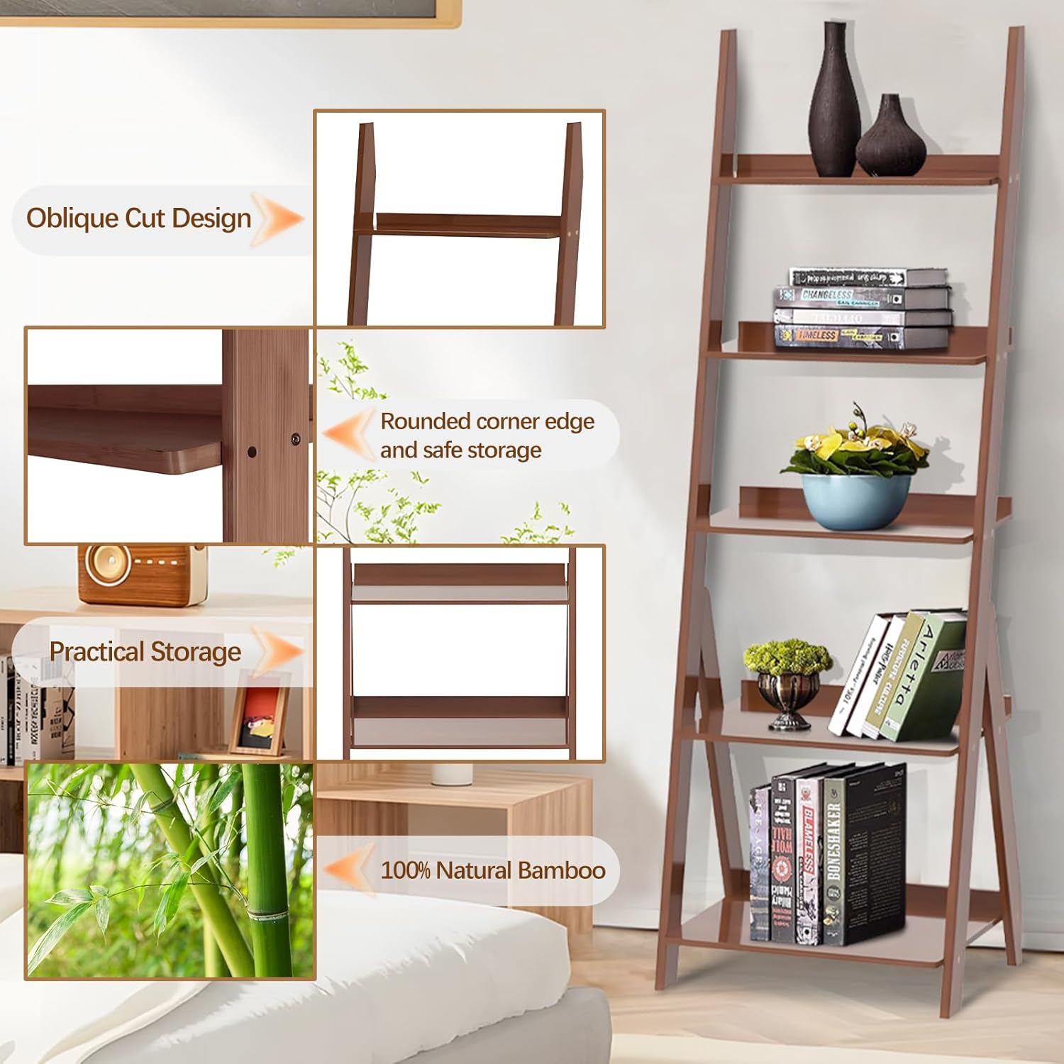 DOUSY-5-Tier Ladder Shelf Bookcase, Bamboo Ladder Bookshelf Leaning Book Shelf, Freestanding Storage Shelf Boho for Living Room, Home Office, Bedroom, Balcony, Walnut