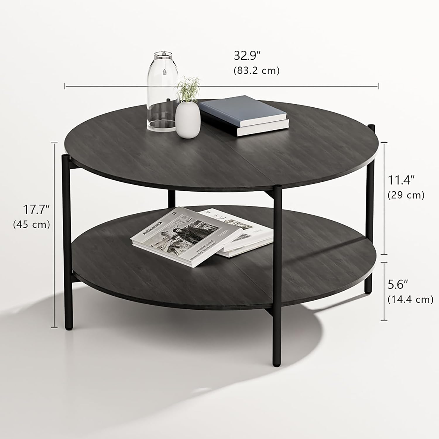 - 【2-Tier Storage】Kasrikly round coffee table 2-tier open design, enough storage space to help you maintain a tidy living space. The table measures 32.9"D*17.7"H and has a total weight capacity of up to 132 lbs.
