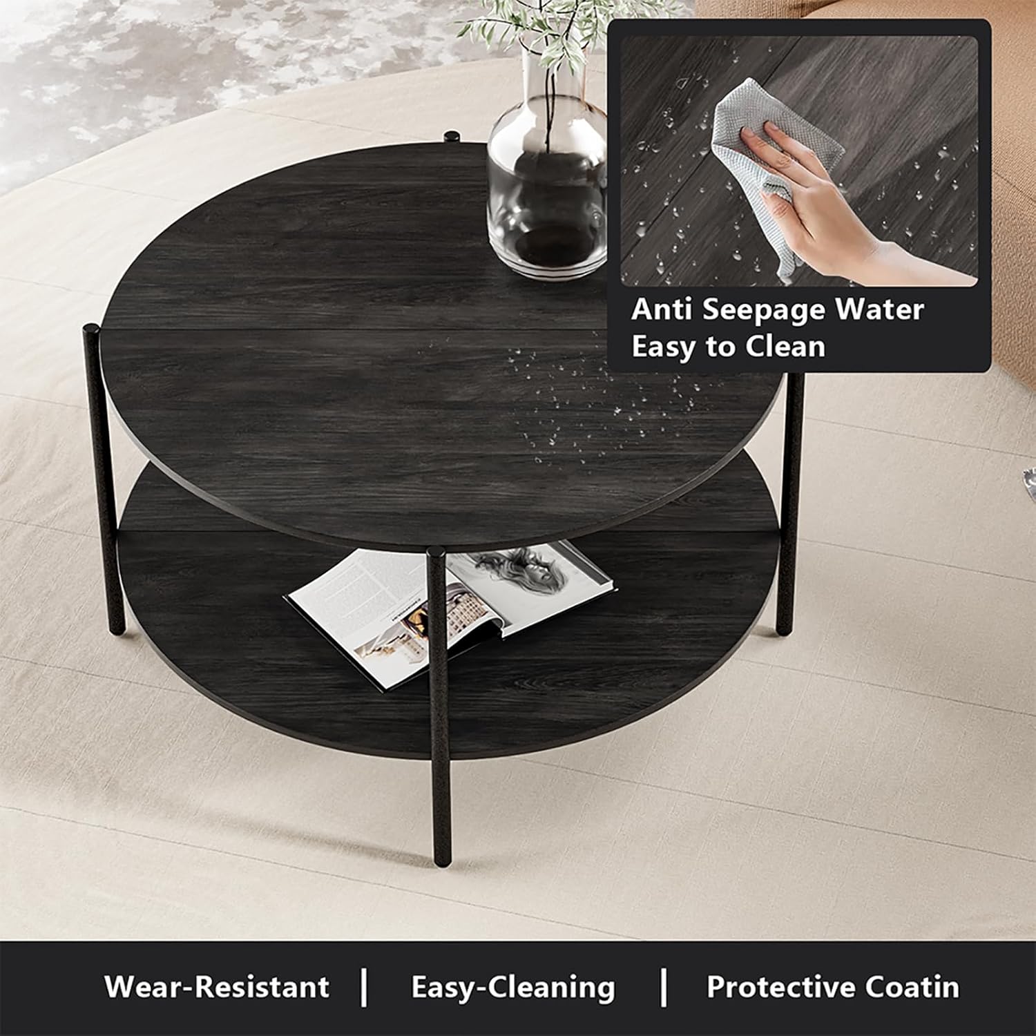 - 【Adjustable & Waterproof】This round wood coffee table is designed with adjustable foot to ensure stability on uneven floors. Non-slip feet prevent scratches on the floor, and the tabletop is smooth, waterproof and easy to clean