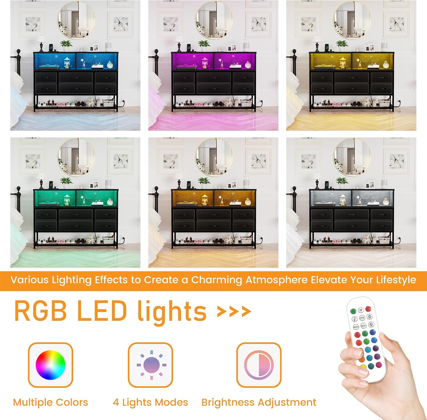 - LED Dresser with Charging Station: The dresser for bedroom with a charging station and LED light, combines functionality with romantic style. You can easily control these LED lights with the included remote control or app to create ambience. Meanwhile, our storage chest of drawers with built-in power outlets(2AC+2USB+1TC), lets you easily charge your phone, lamp and other devices, solve the low battery problem