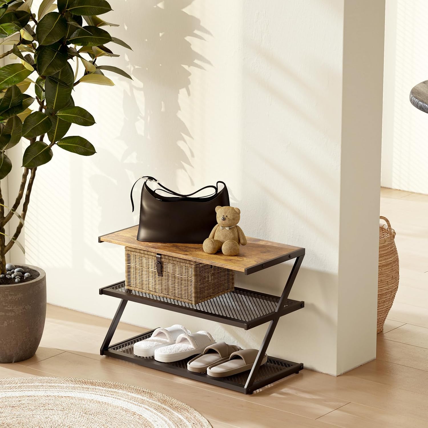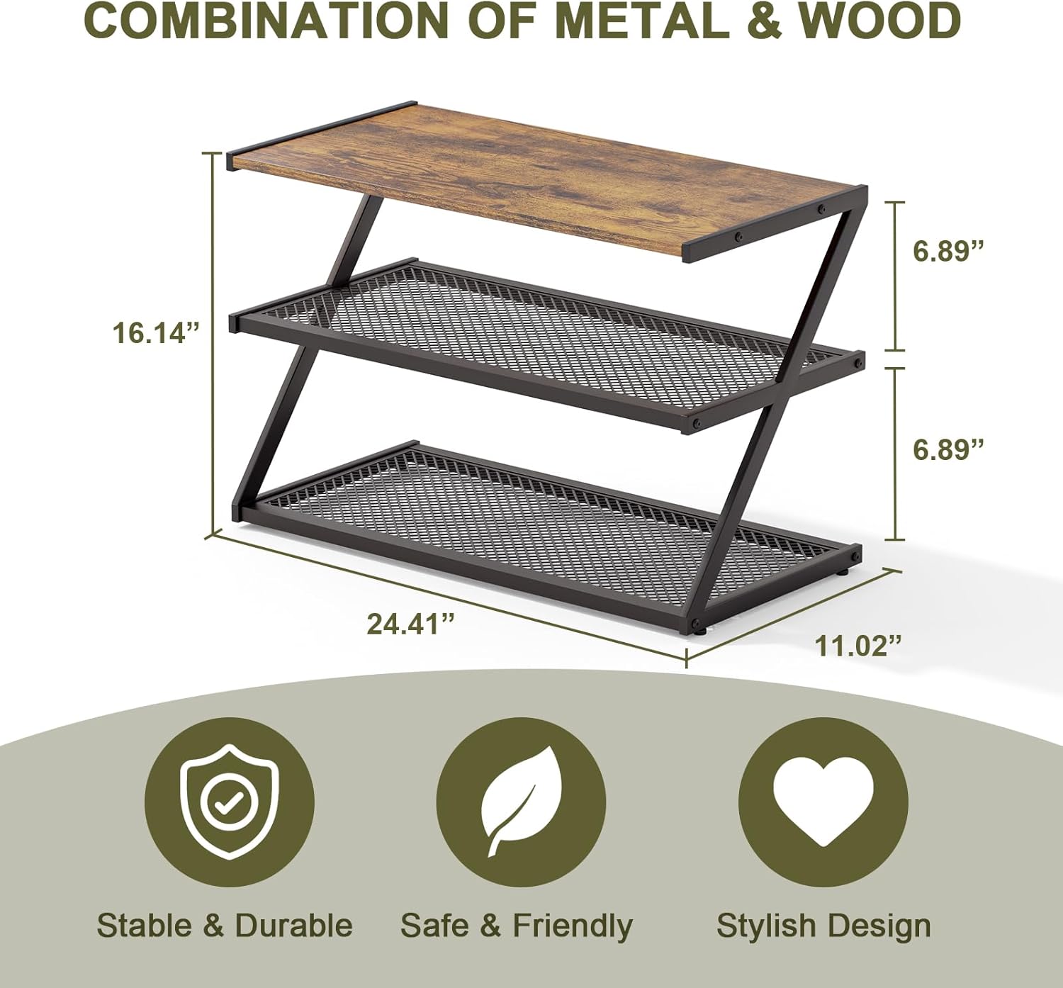 Z-Frame Shoe Rack with Wooden Top & Metal Mesh Shelves - Space-Saving Storage for Hallway, Living Room, Closet & Bedroom (24.41" x 11.02" x 16.14")