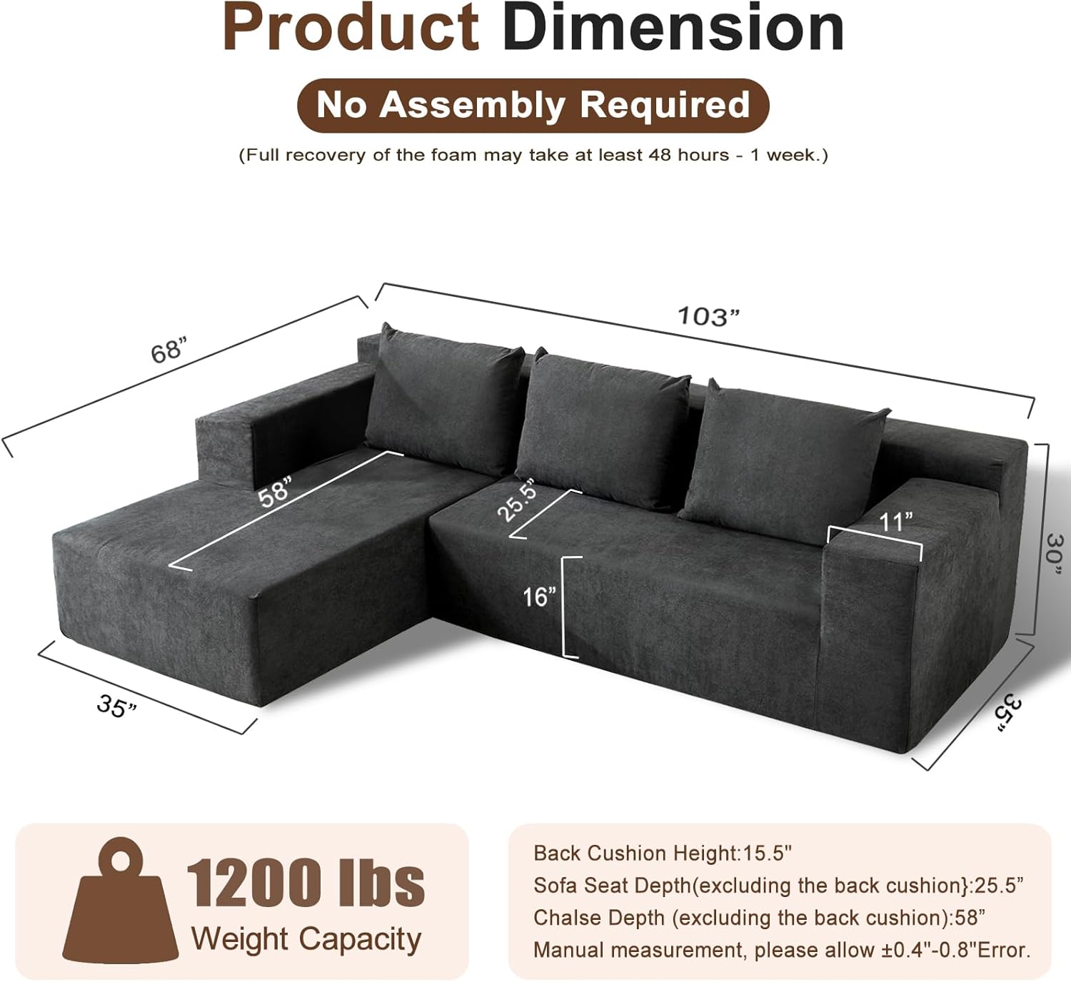 103" Cloud Sectional Sofa, Boneless L-Shape Couch with Chaise, Modern Minimalist Modular Couch for Living Room, Free Combination Deep Seat Corner, No Assembly Required, Dark Grey