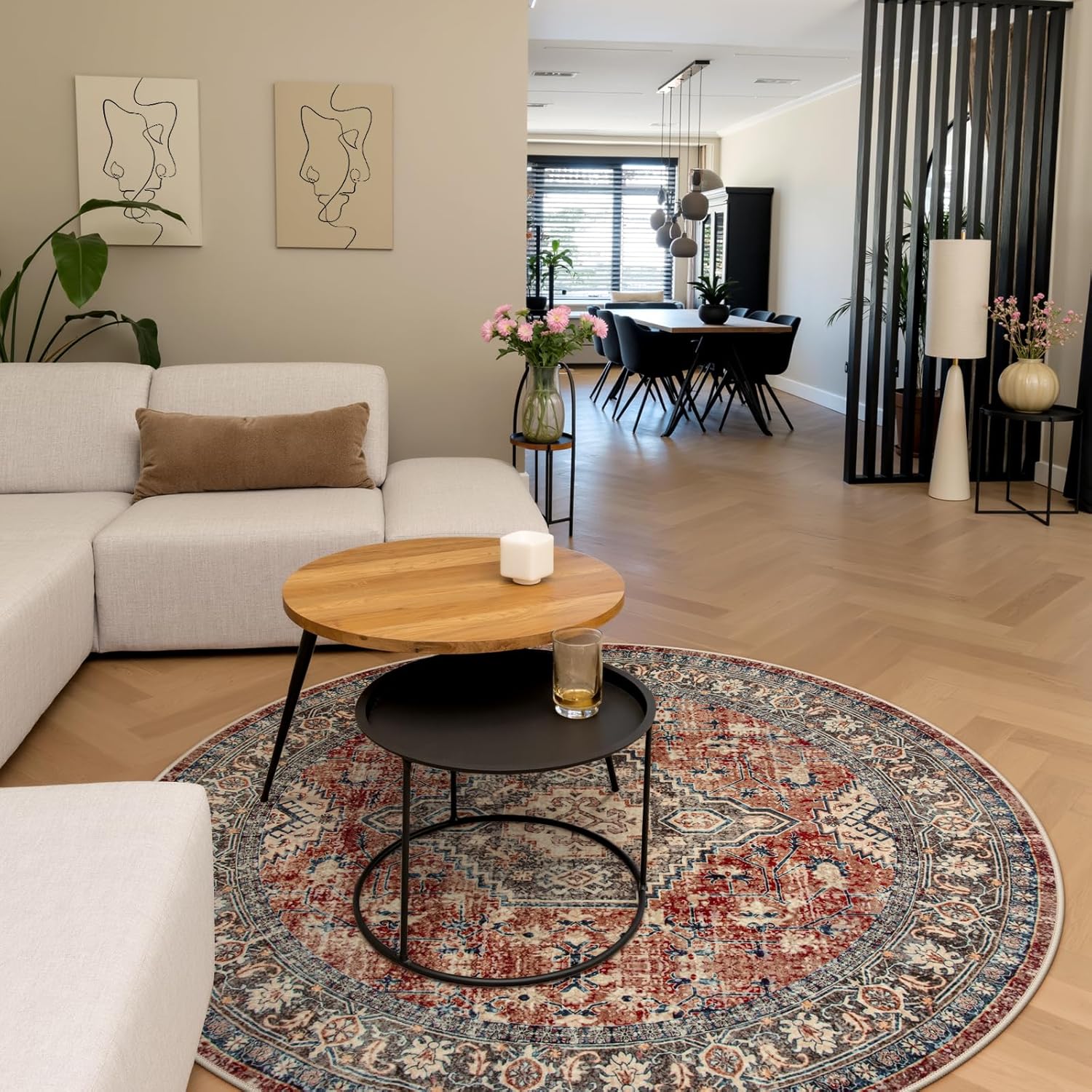 Lahome Oriental Washable Round Area Rug, Non-Slip Round Rugs 6ft Ultra-Thin, Soft Large Throw Circle Carpet for Living Room Bedroom Kitchen Nursery, Brick Red