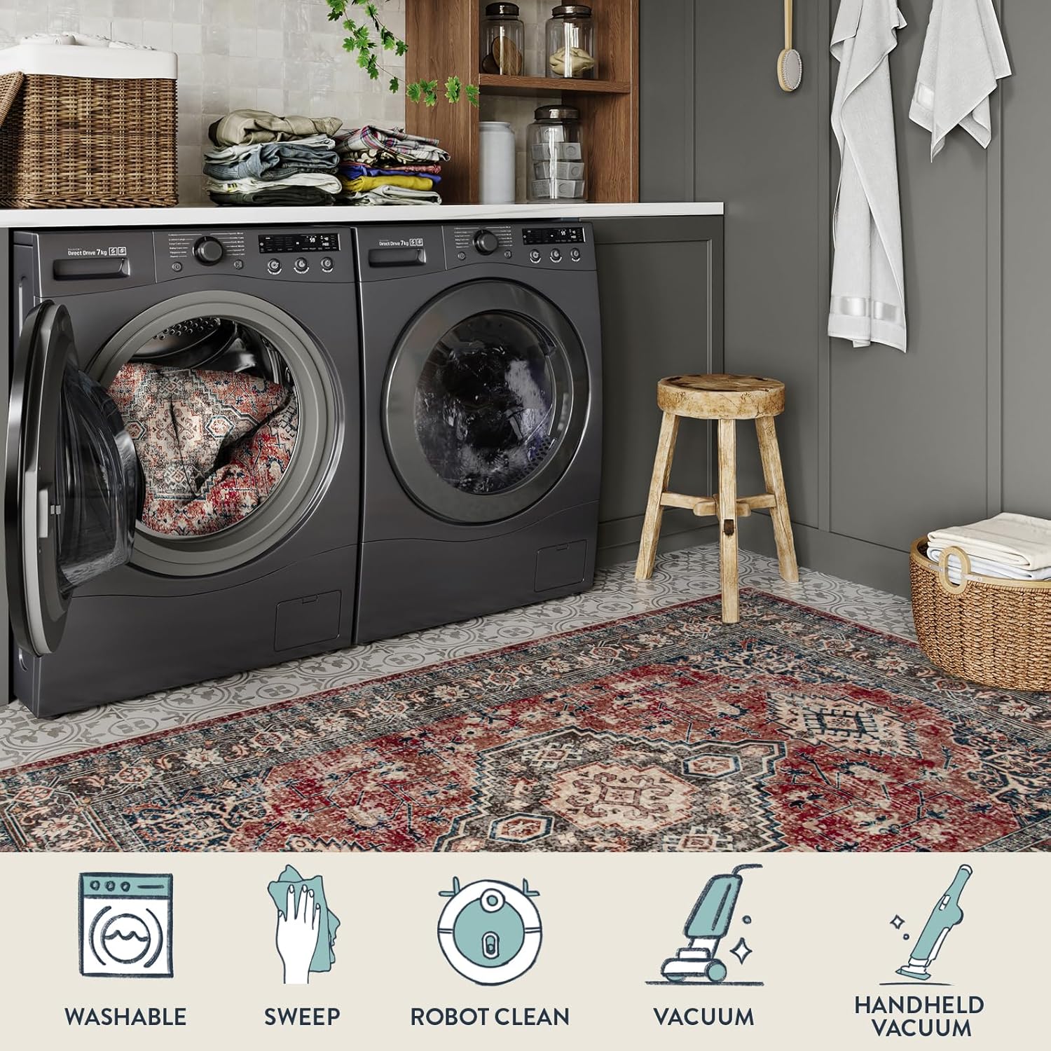 Lahome Oriental Washable Rugs for Bedroom, 4X6 Soft Living Room Rug Ultra-Thin Non-Slip Stain Resistant Vintage Low-Pile Throw Carpet for Office Entryway, Brick Red