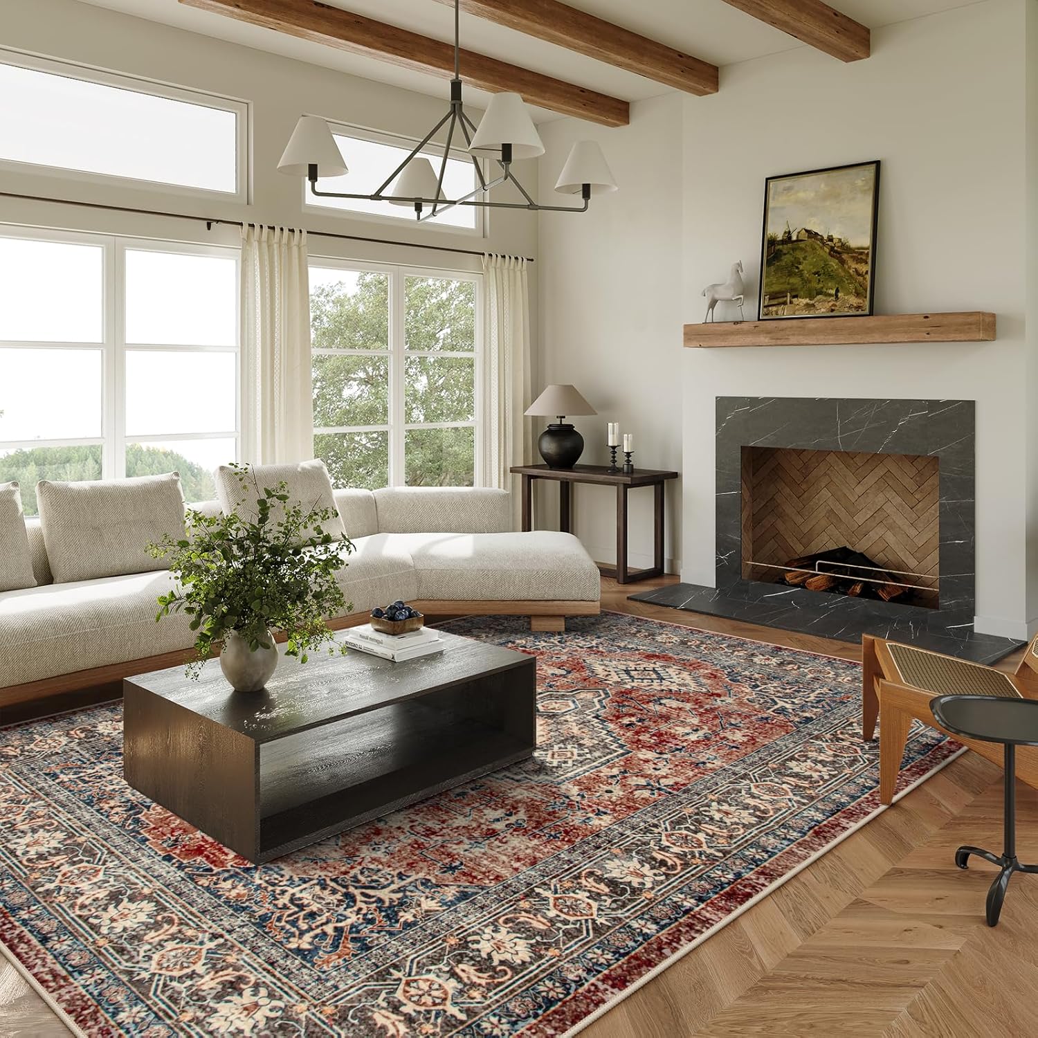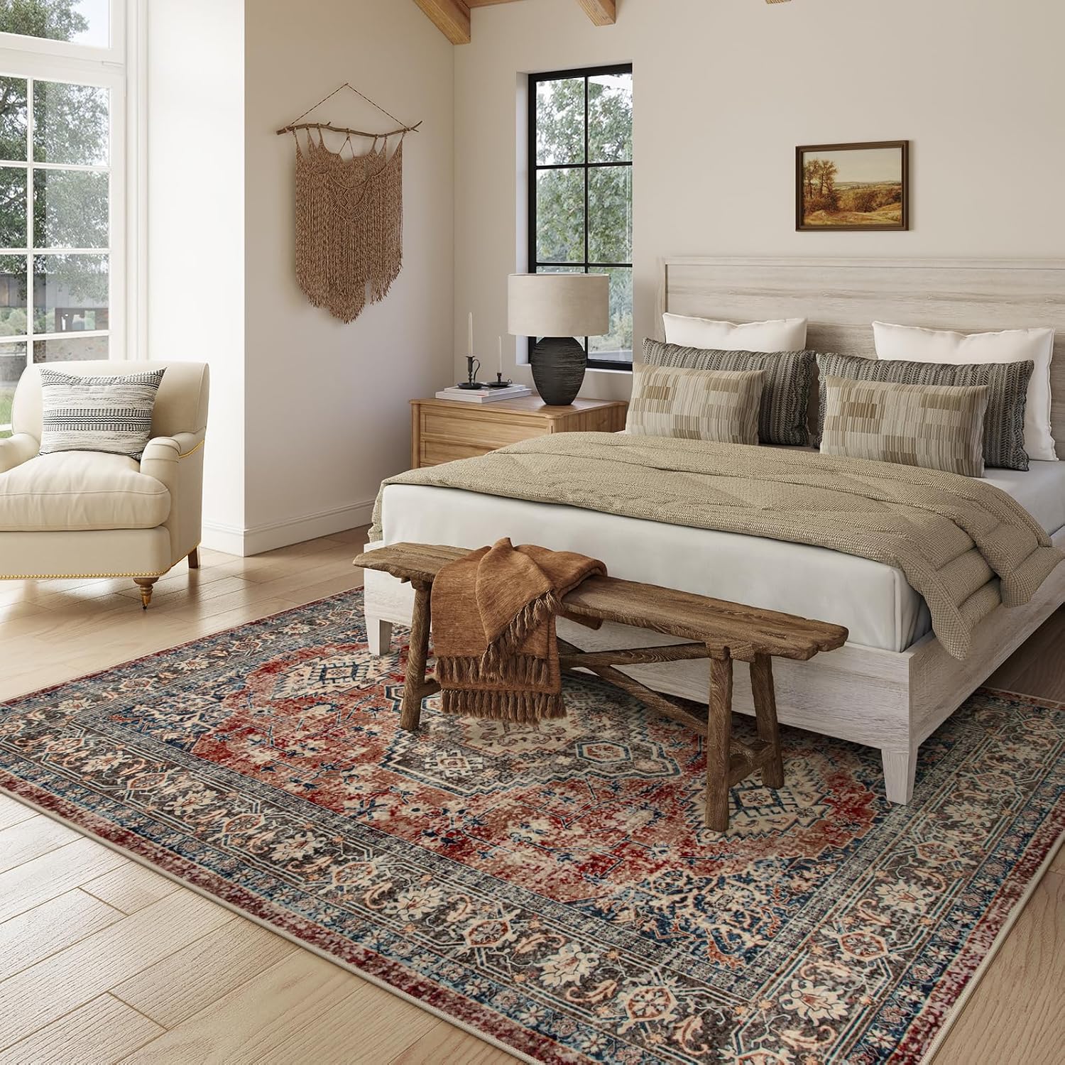 Lahome Oriental Washable Rugs 8x10, Non-Slip Soft 8x10 Rugs for Living Room Bedroom, Stain Resistant Ultra-Thin Vintage Accent Carpet for Dining Room Office, Brick Red