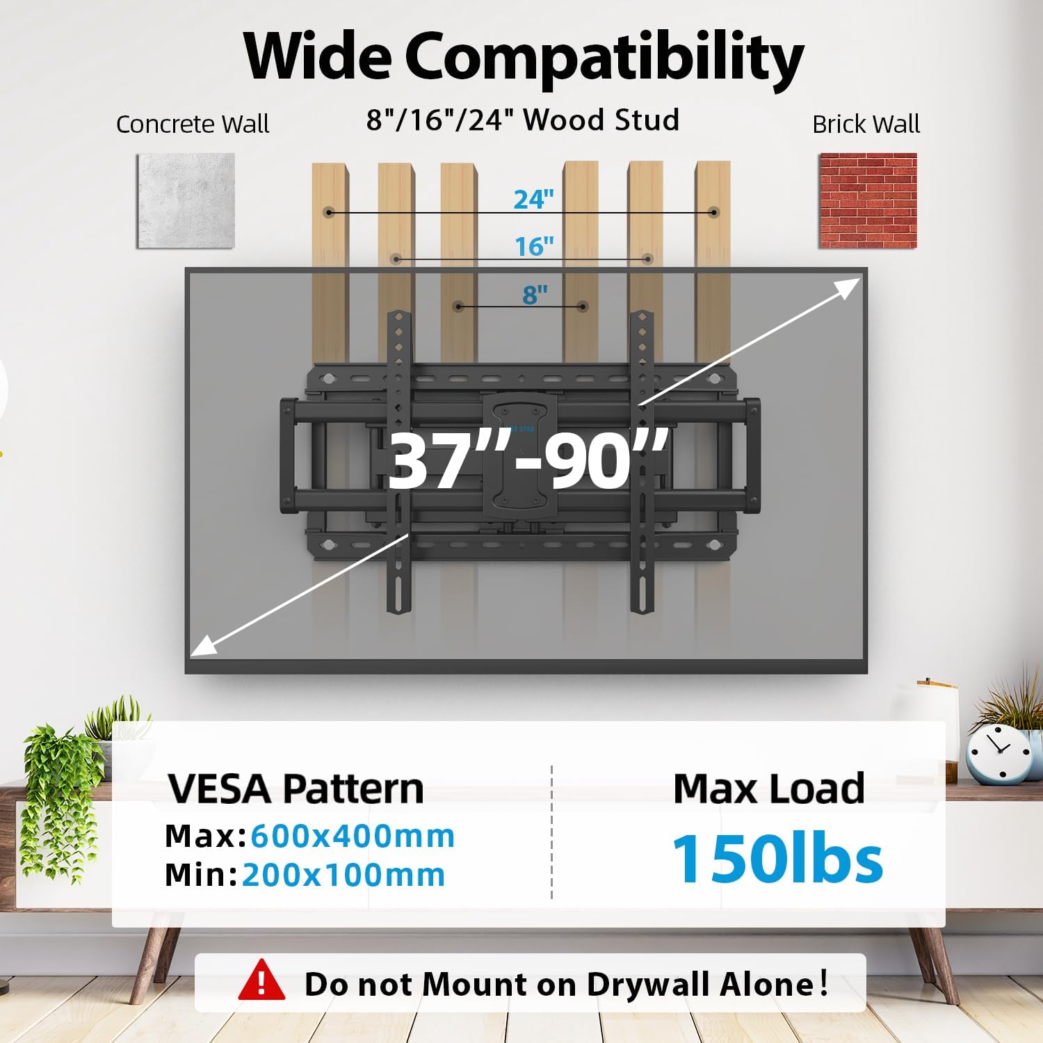 37-90 inch Full Motion TV Wall Mount, Fits 24" Wood Studs, Wall Mount tv Bracket with Smooth Swivel, Tilt, Extension, TV Mounts Hold up to 150lbs, Max VESA 600x400 mm, Fit Most 75 85 86 TVS