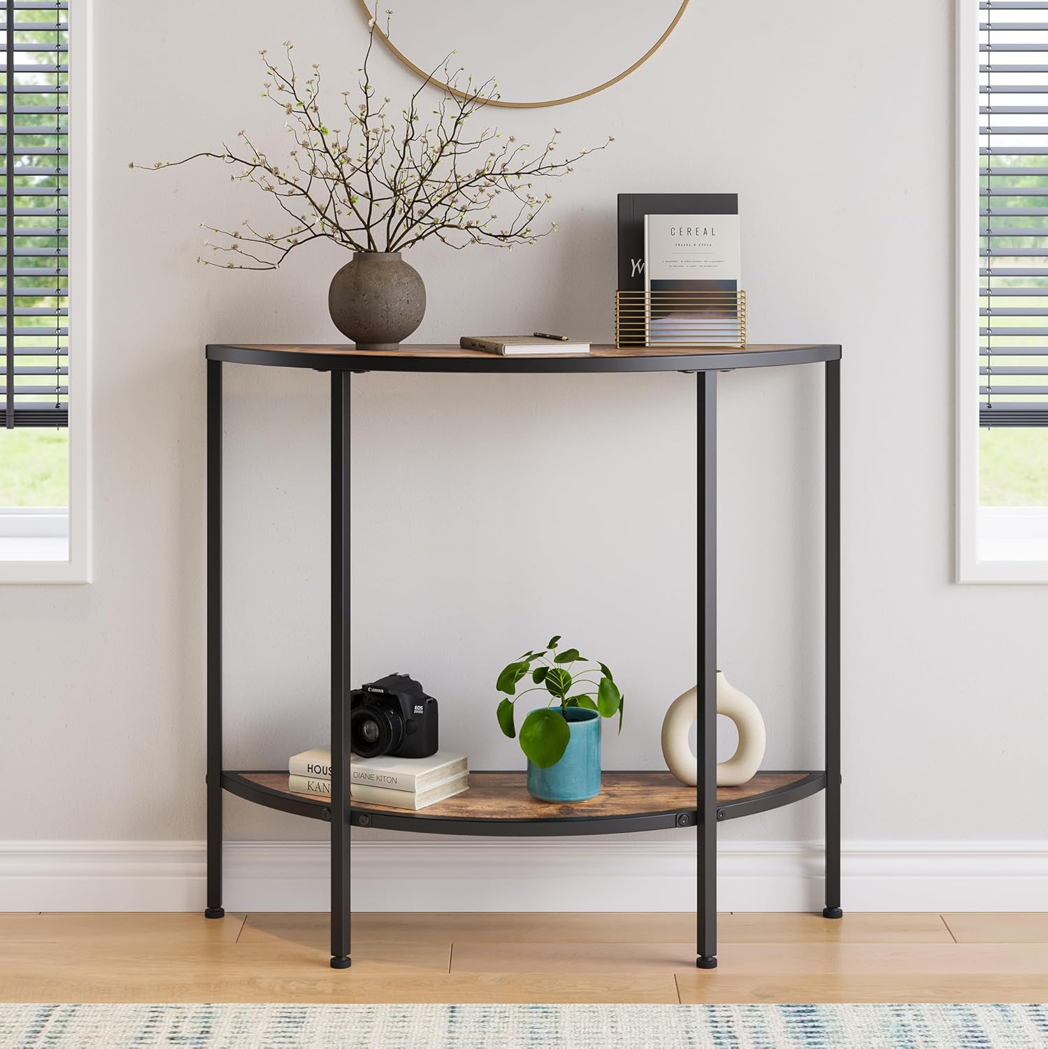 Entryway Table with Storage,Narrow Console Table for Living Room Coffee Table 2-Tier Half Moon Sofa Table,Small Entry Table,Hallway Side Table with Metal Frame,Rustic Brown and Black