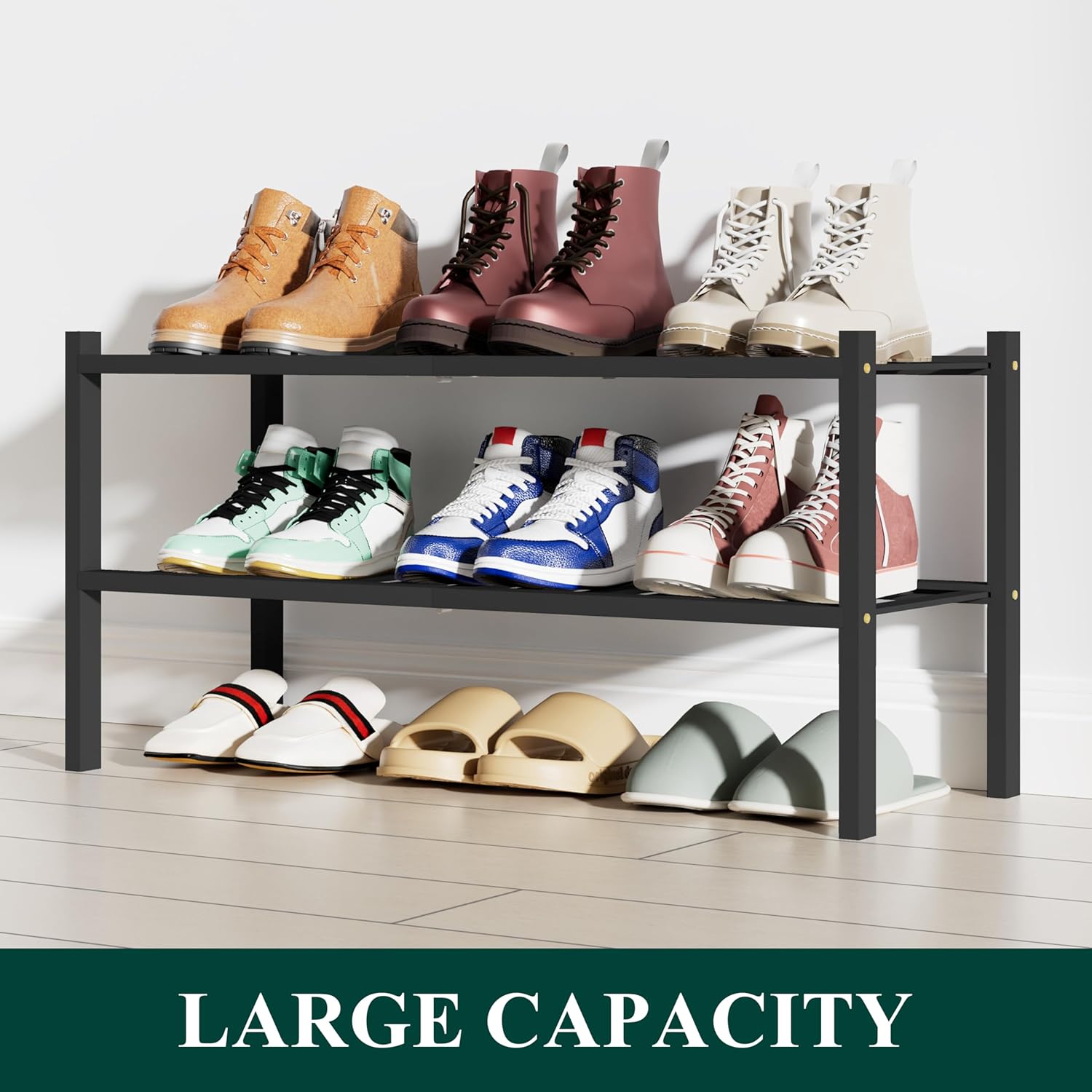 Smiry Shoe Rack, 2 Tier Bamboo Shoe Organizer, Stackable Free Standing Wooden Shoe Storage Shelf for Closet, Entryway, Front Door Entrance, Black