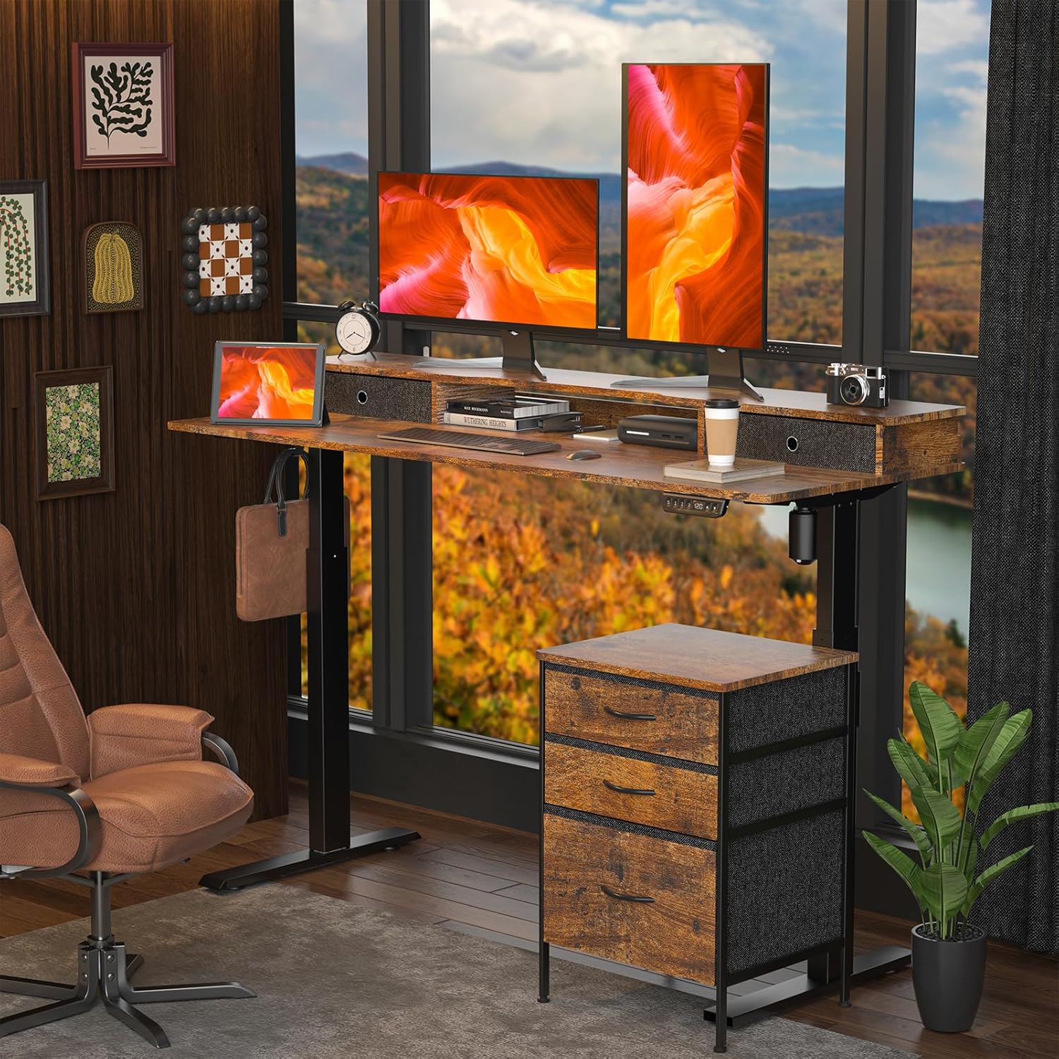 63 Inch Electric Standing Desk with Cabinet & Drawers, Height Adjustable Sit Stand Desk with Monitor Shelf, Smart Home Office Standing Computer Desk, Rustic Brown