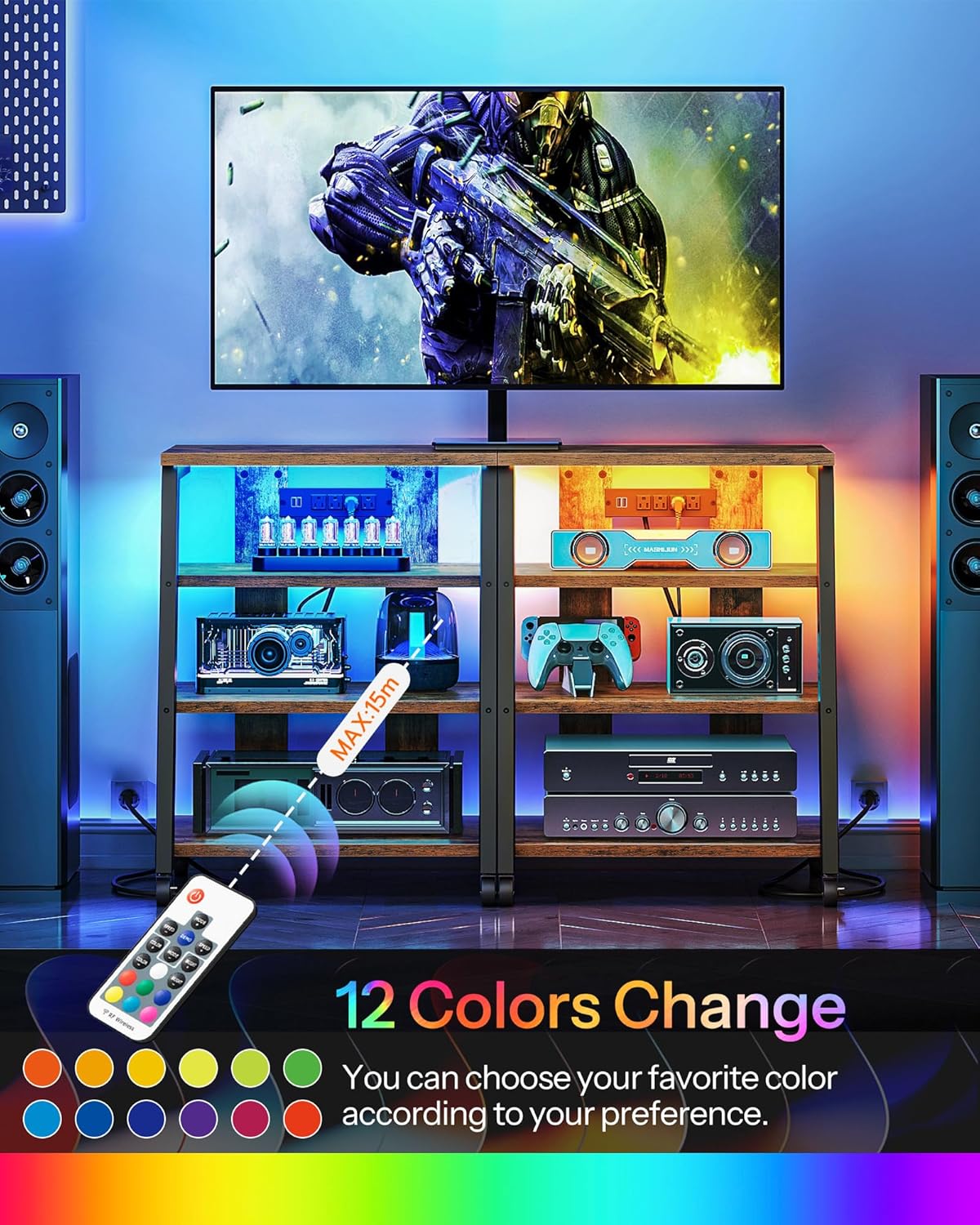- Multi-Port Charging Station and Adjustable LED Lights: The stereo stand has 4 AC outlets and 2 USB ports for convenient charging. With a 12-color adjustable LED strip, you can customize the lighting to enhance your music, gaming, and movie-watching ambiance