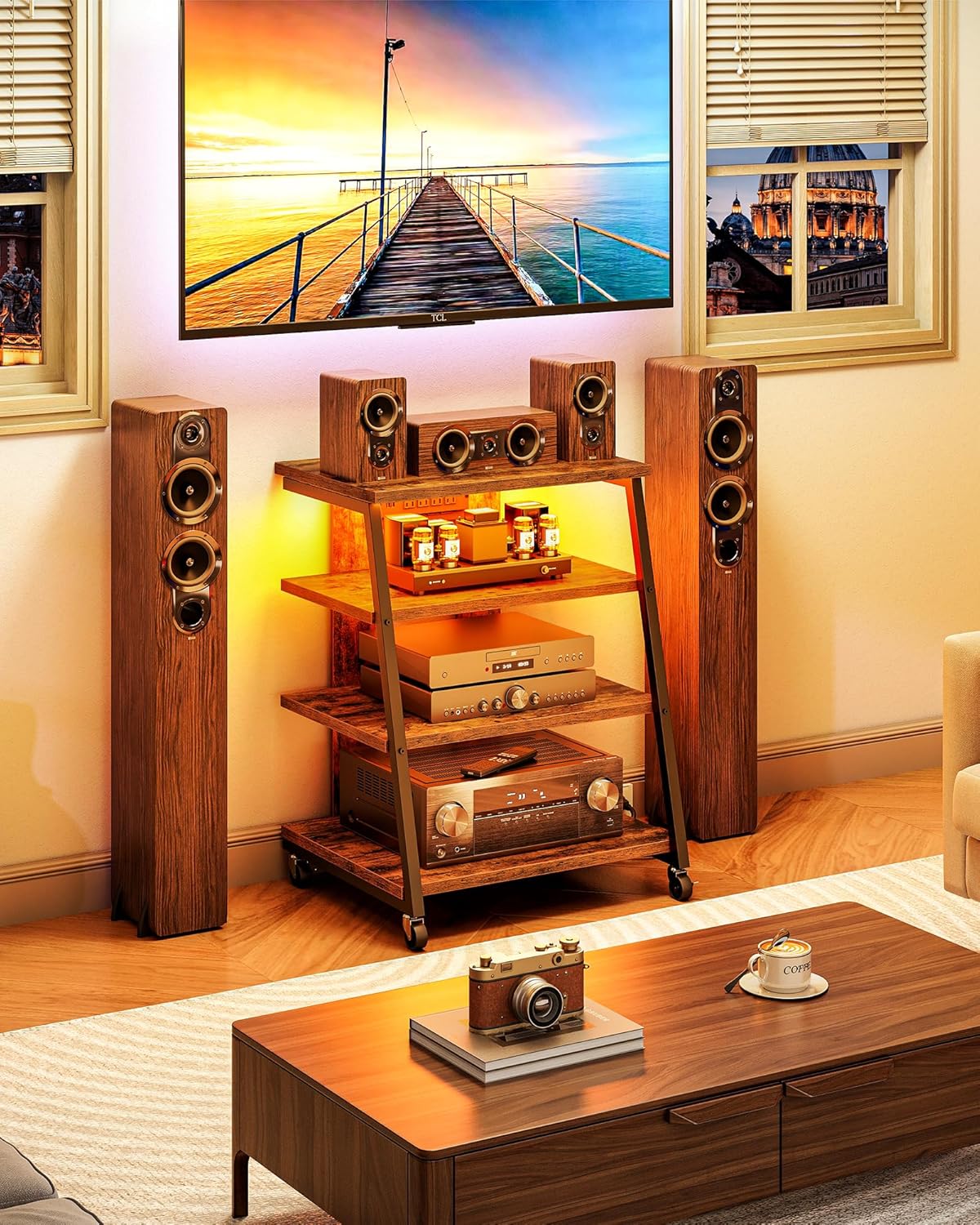 4-Tier AV Media Stand with Wheels, Stereo Stands, Media Console Shelf with Power Strips, LED Lights, Wooden Audio Cabinet Rack Tower, Rustic Brown and Black TCJ60UDBF