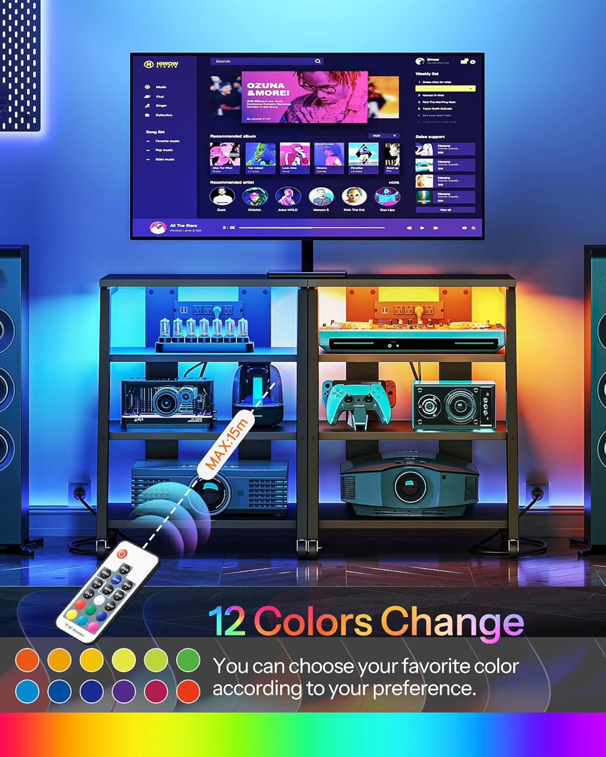 - Multi-Port Charging Station and Adjustable LED Lights: The stereo stand has 4 AC outlets and 2 USB ports for convenient charging. With a 12-color adjustable LED strip, you can customize the lighting to enhance your music, gaming, and movie-watching ambiance