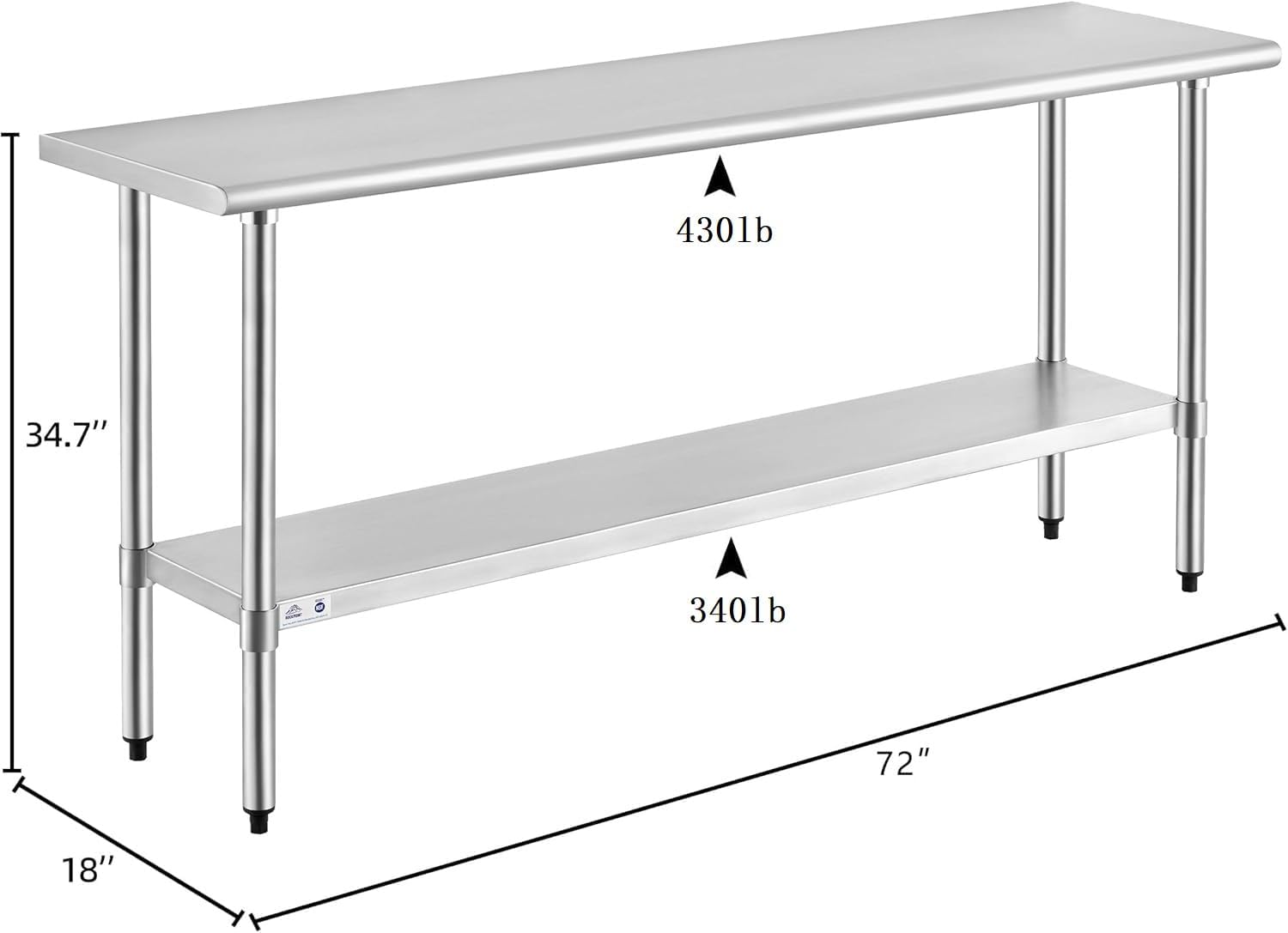 - Durable 2 Layer Design -This heavy duty table desktop load capacity is 430 lbs, and the undershelf can carry 340 lbs. Its strong load - bearing capacity can easily carry microwave oven, kitchen utensils or any other tools.Dimension 18 by 72 by 34.7 inches (DxWxH), offer you enough storage room