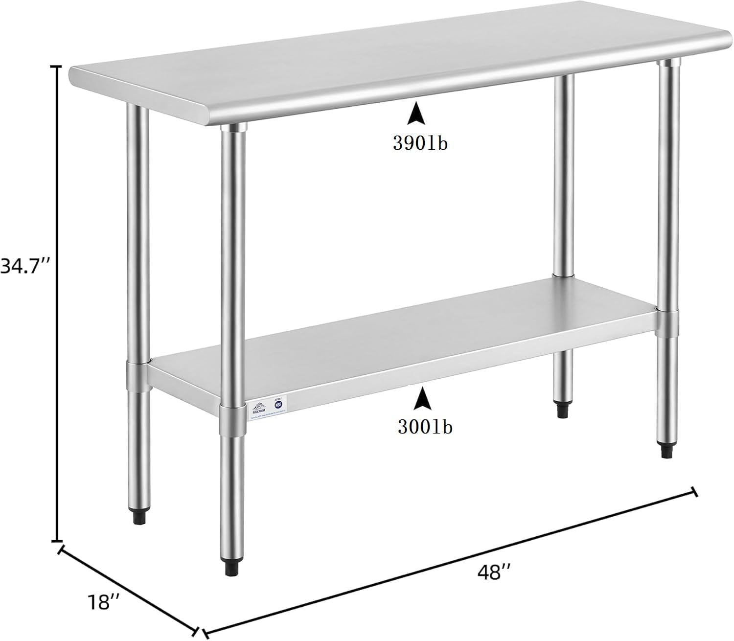 - Durable 2 Layer Design -This heavy duty table desktop load capacity is 390 lbs, and the undershelf can carry 300 lbs. Its strong load - bearing capacity can easily carry microwave oven, kitchen utensils or any other tools.Dimension 18 by 48 by 34.7 inches (DxWxH), offer you enough storage room