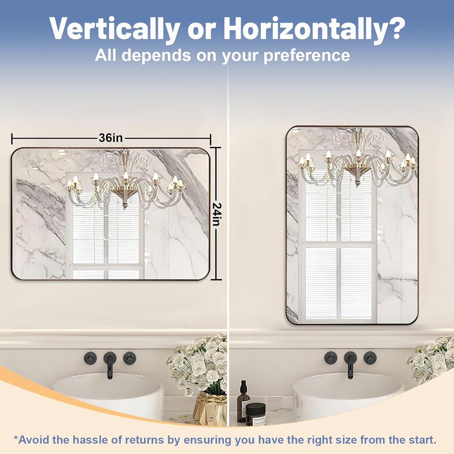 24x36 Inch Brushed Bronze Bathroom Mirror for Wall, Metal Framed Rectangle Mirror with Rounded Corner, Bathroom Vanity Mirror in Aluminum Alloy, Hangs Horizontally or Vertically