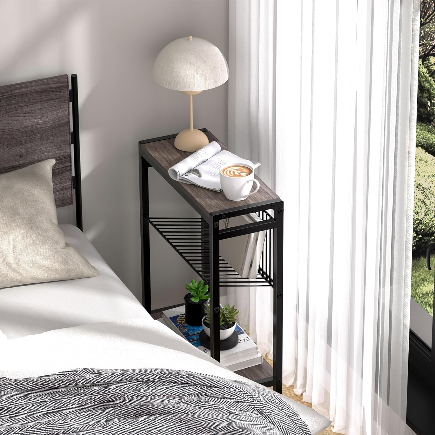 Small Side Table Set of 2 for Small Space, 3-Tier Narrow End Tablewith Magazine Holder,Small Nightstand, Skinny Snack Couch Table in Living Room, Bedroom Study and Balcony(Ash Brown)