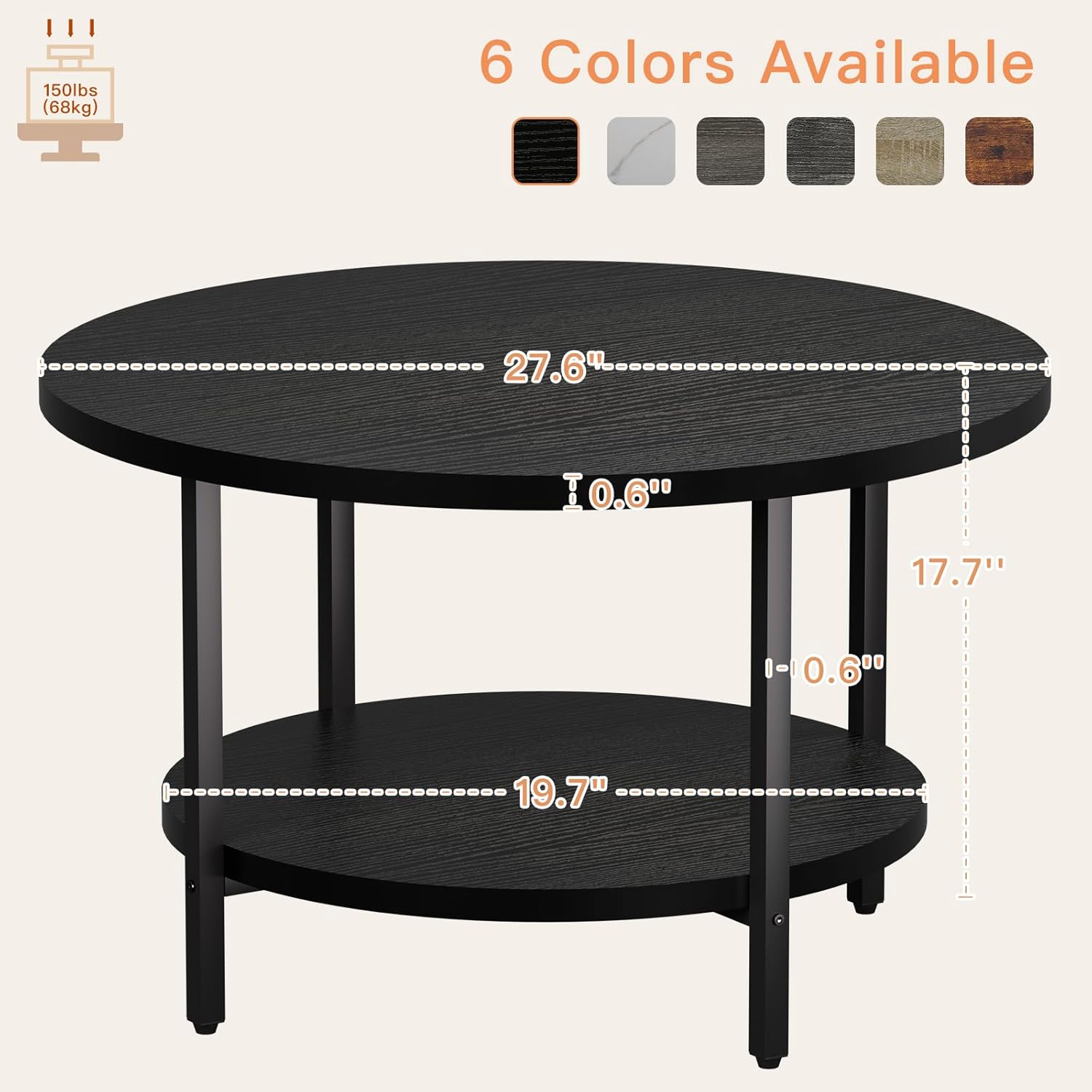 Coffee Table, 2 Tier Coffee Tables for Living Room, Round Coffee Table with Storage, Floor Table for Bedroom, Home Office, Black (27.6" D x 17.7" H)