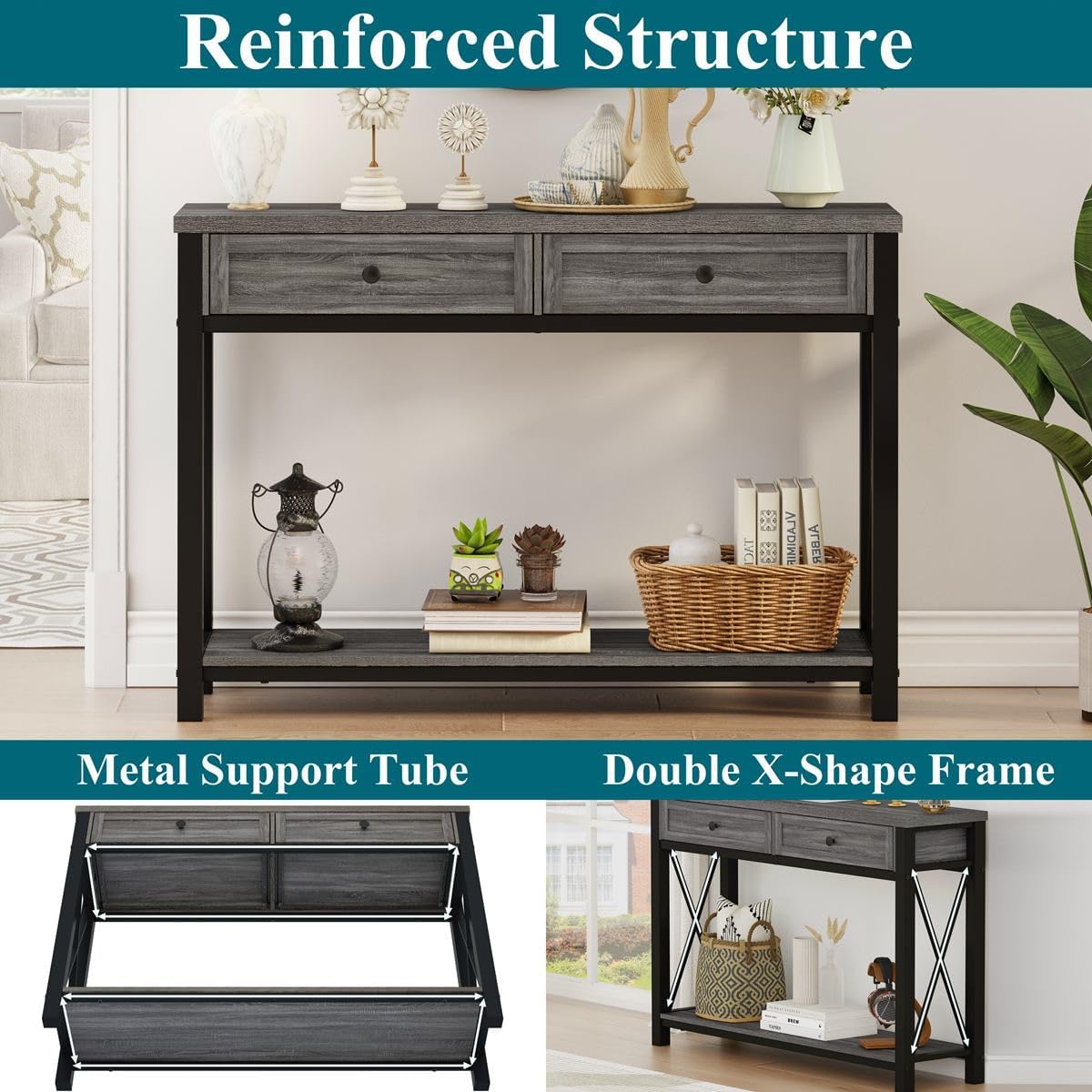 BON AUGURE Sofa Table with Drawers, Console Tables for Entryway, Sofa Table with Storage, Couch Tables for Living Room, Hallway, Foyer, Entry (Dark Grey Oak, 47 Inch)