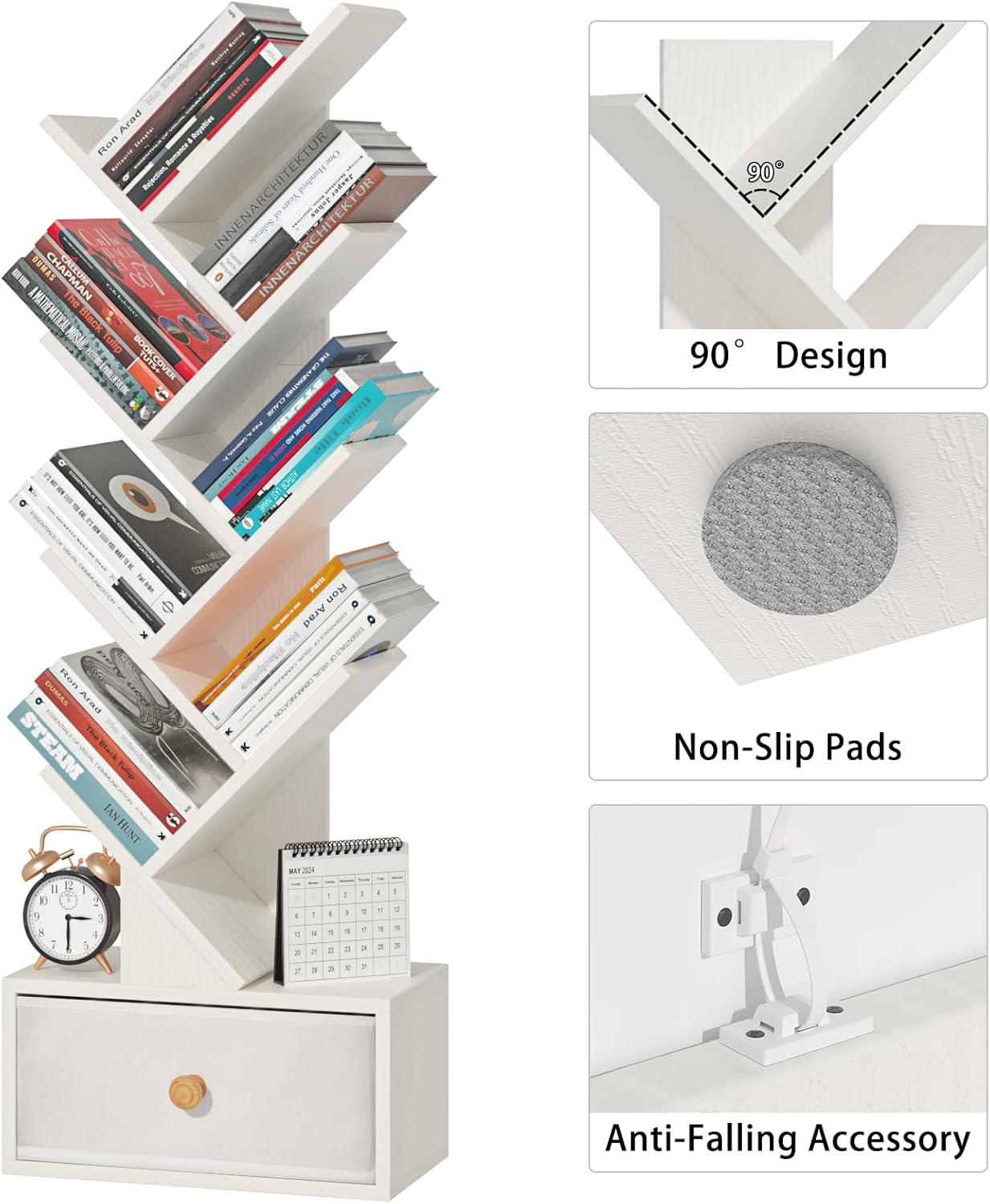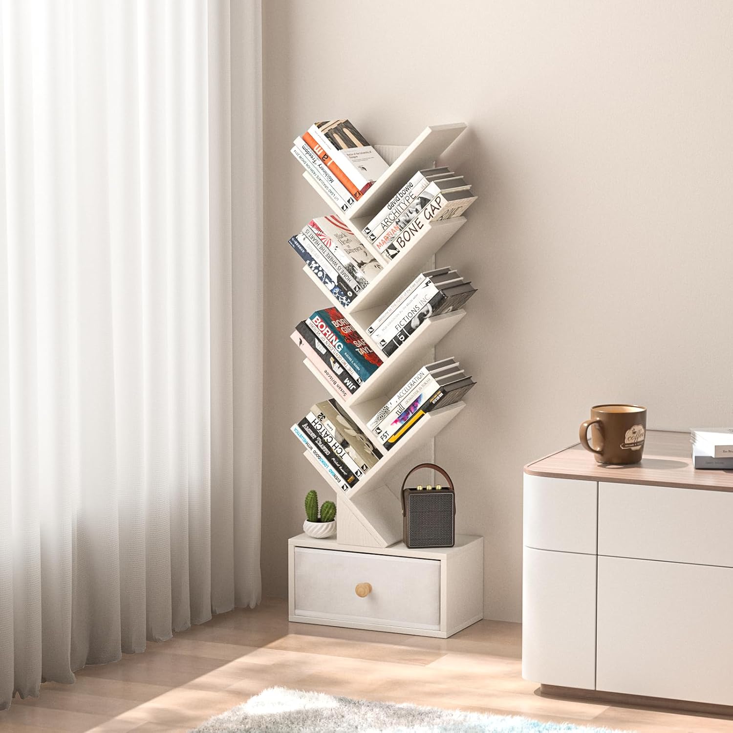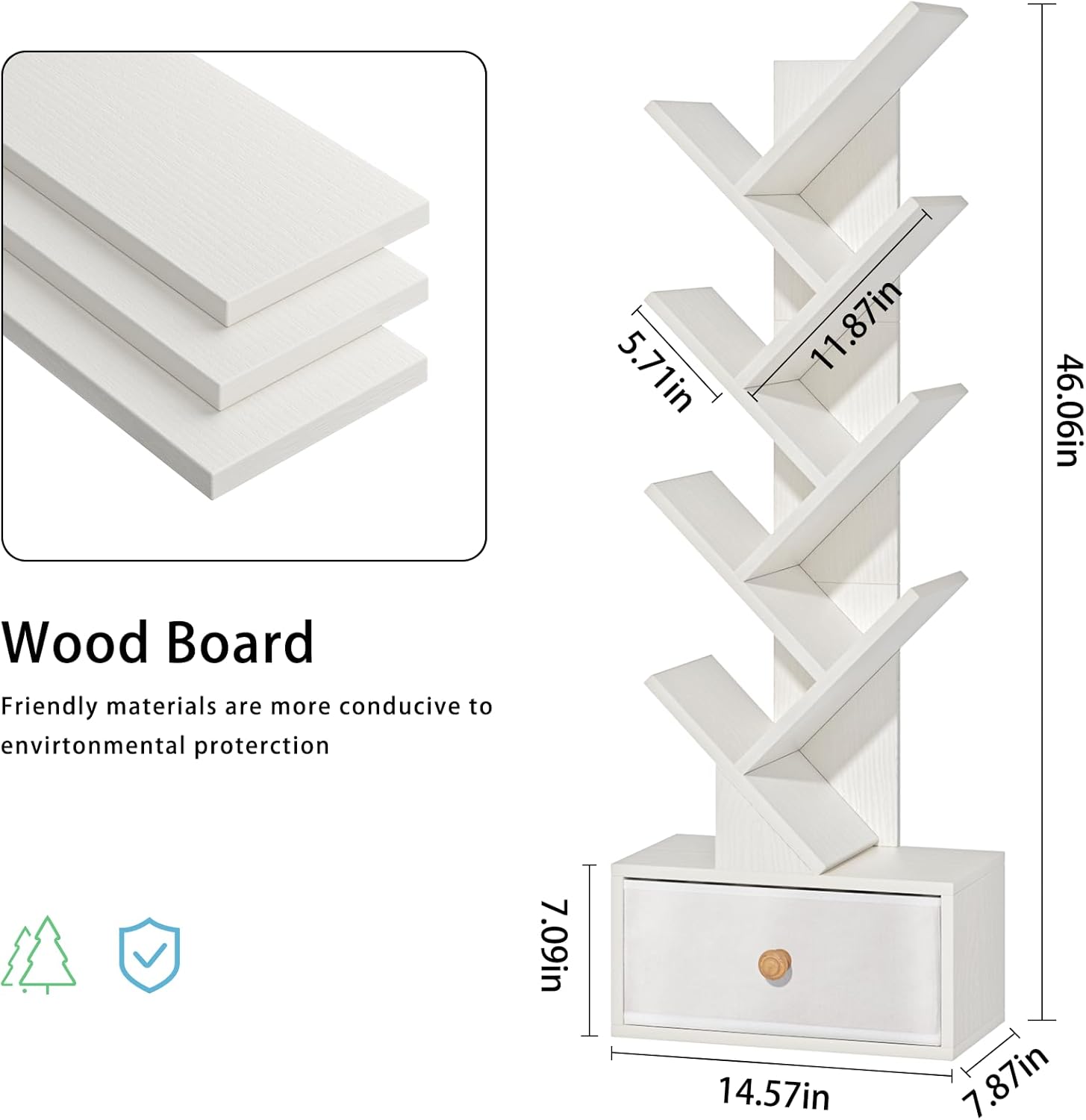 8 Tier Tree Bookshelf with Drawer, Free Standing Wood Bookcase for Narrow Space, Storage Organizer Bookshelves for Books, Book Case for Home Office, Living Room, Bedroom - Sweet White