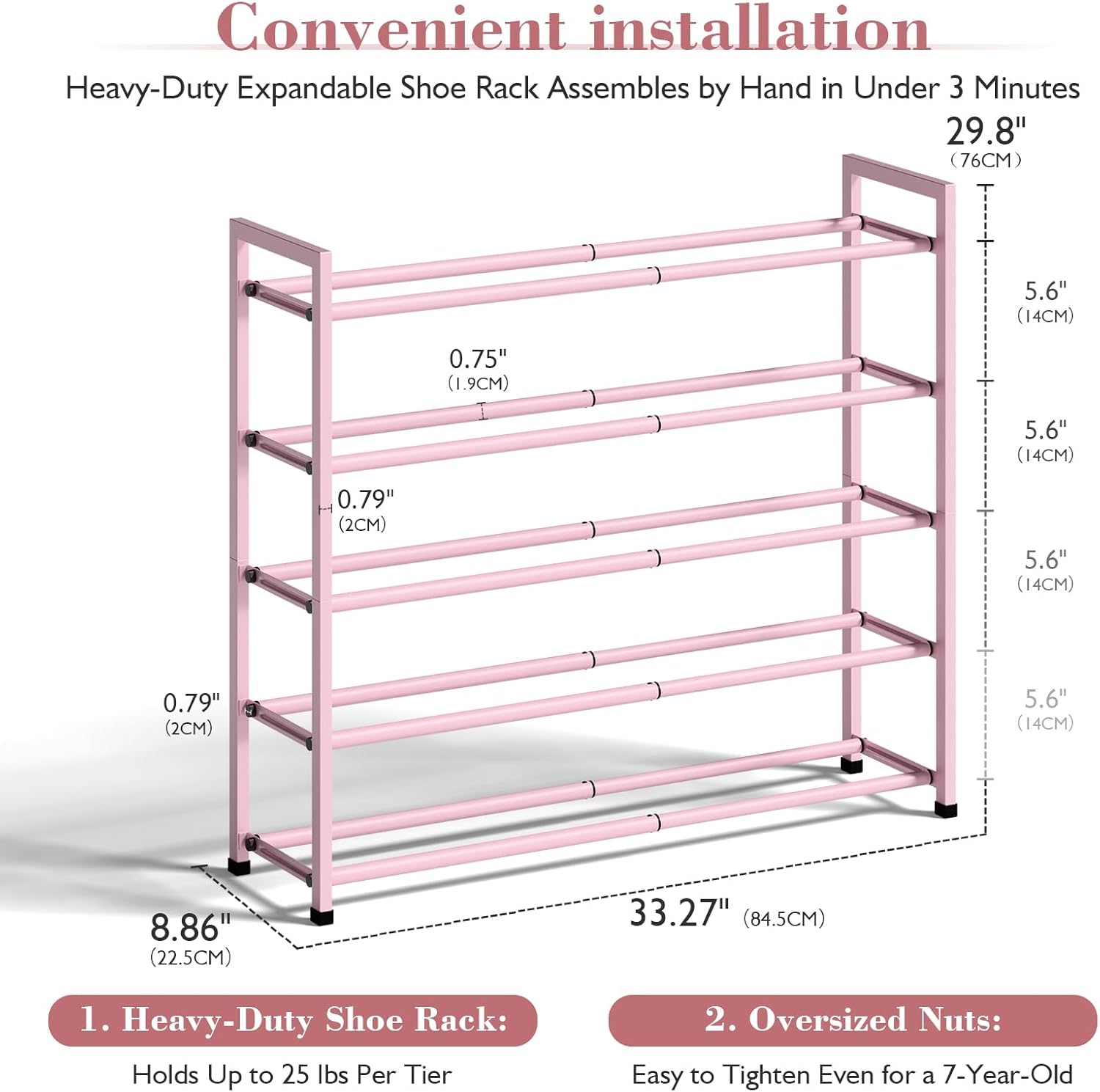 Bumusty 5-Tier Expandable Shoe Rack for Closet, 18“-33” Adjustable Shoe Rack for Small Space, Small Shoe Organizer for Front Door, Sturdy Metal (Pink)