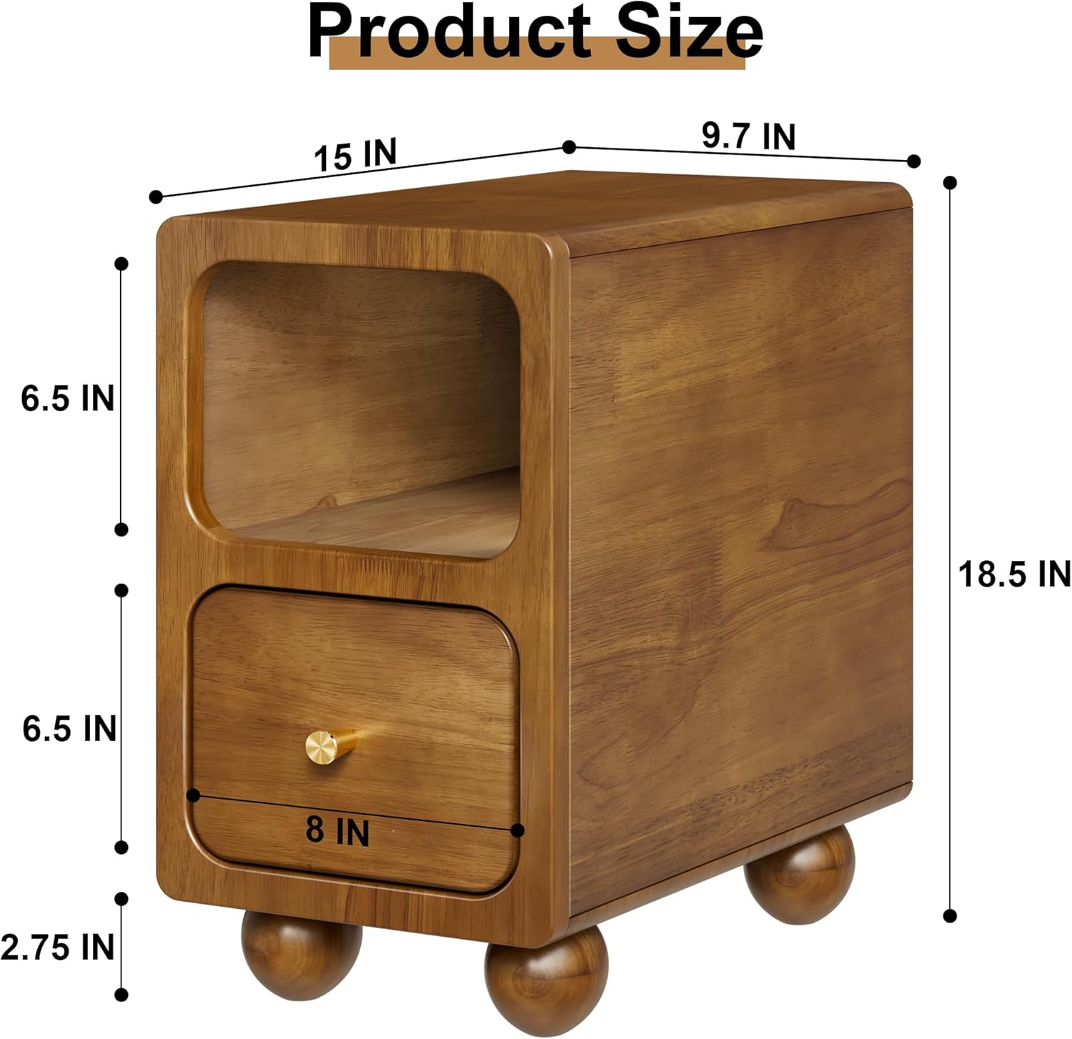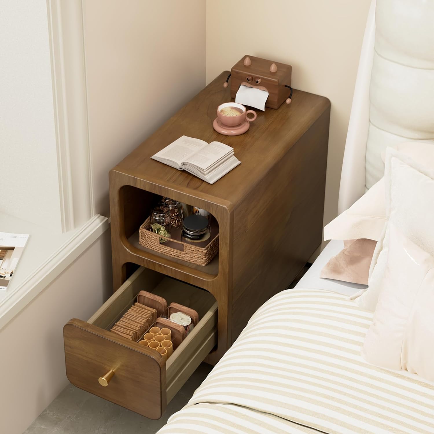 Solid Wood Nightstand, Narrow Night Stand with Drawers, Walnut Mid Century Modern Nightstand, Small Beside Table with Open Storage Shelf for Bedroom (10 inch)