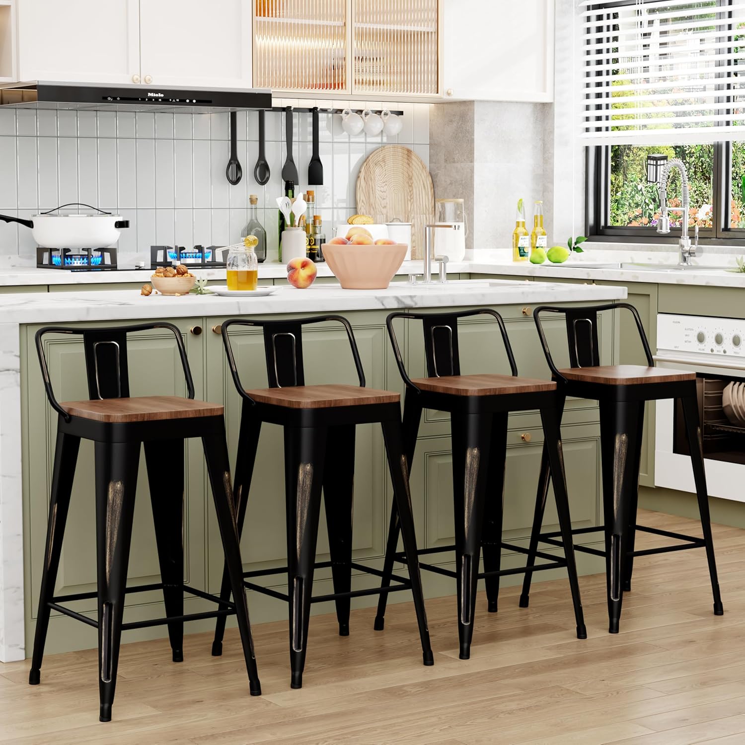 WENTMENT Bar Stools Set of 4 Counter Height Bar Stools Metal Barstools with Removable Back 26" Kitchen Bar Stools with Wooden Seat, Distressed Black