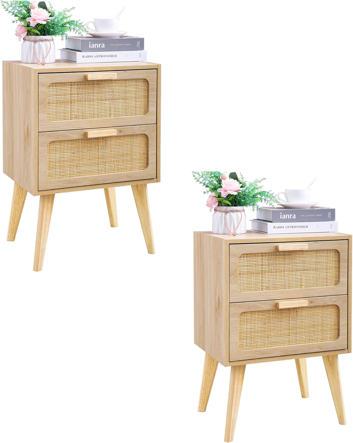 Rattan Nightstand Set of 2,Side Table with Hand Made Rattan Decorated Drawers,Boho Bedside Table,Wood Accent Table with Storage for Small Space,Livingroom, Bedroom, Natural CTG59Y-2