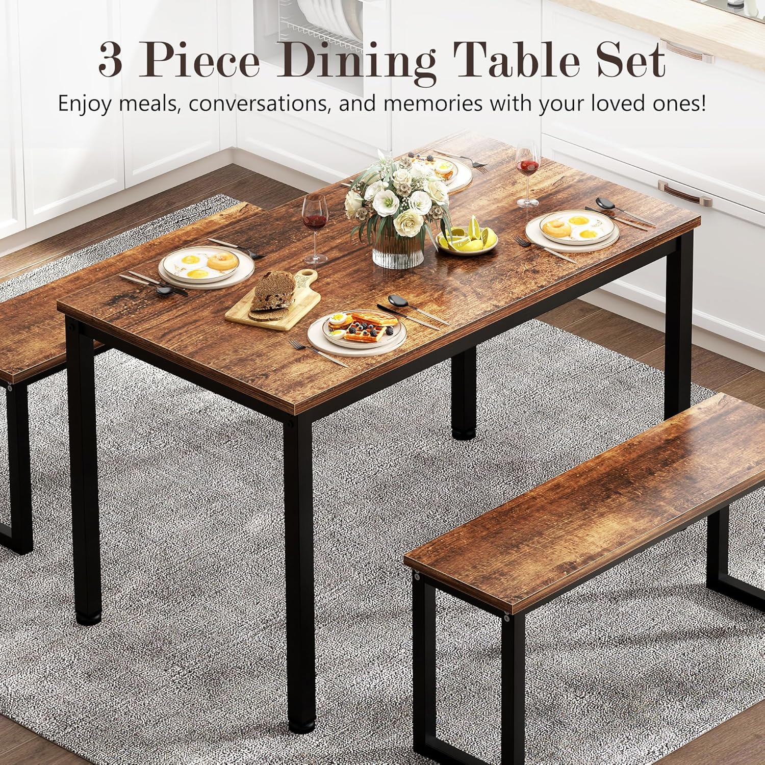 soges 39.4 in Kitchen Table Set with 2 Benches, Dining Table Set for 4, 3 Piece Wooden Industrial Style Dining Room Table and Long Benches, Breakfast Table Coffee Table Set, Retro