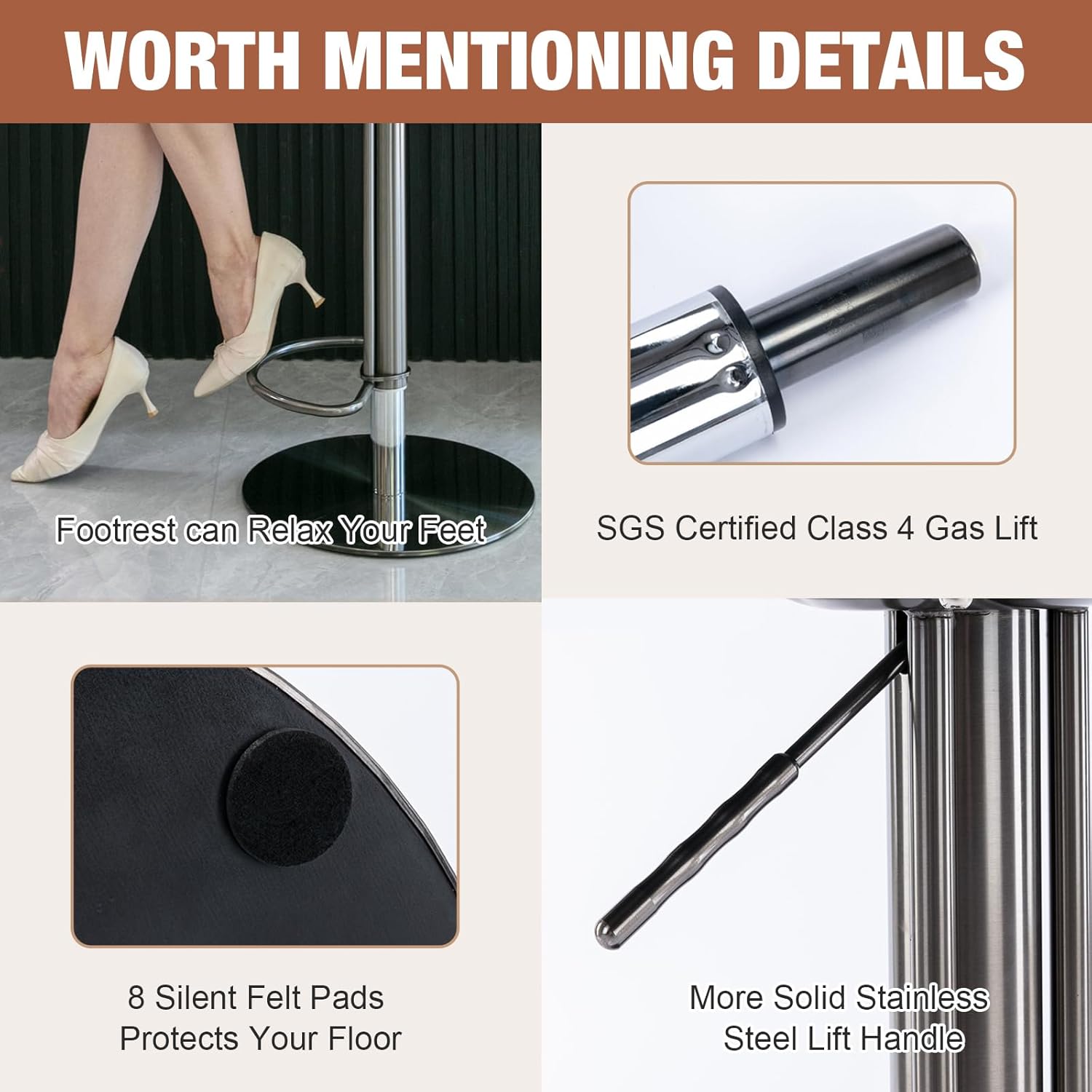 - [High-quality bar stool] The bar stool is well made, and the seat is padded with a high-tight elastic sponge and covered with breathable high-quality leather material, it relieves the back and legs and relaxes your muscles, it can bring you a pleasant experience. The stainless steel frame is strong and durable, and with this good material, the bar chair lasts long.