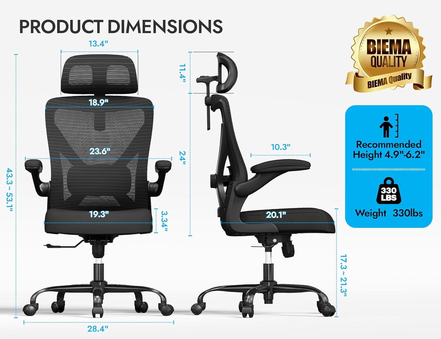 - Ergonomic Office Chair: Experience unparalleled support with our ergonomic office chair, designed to provide comprehensive assistance for your head, back, hips, and arms. Tailored lumbar support ensures your comfort and well-being. Suitable for people of about 5'5" to 6'2". Easily adjust seat height, headrest, backrest, and flip-up arms to cater to diverse needs, offering comfortable support during extended periods of sitting