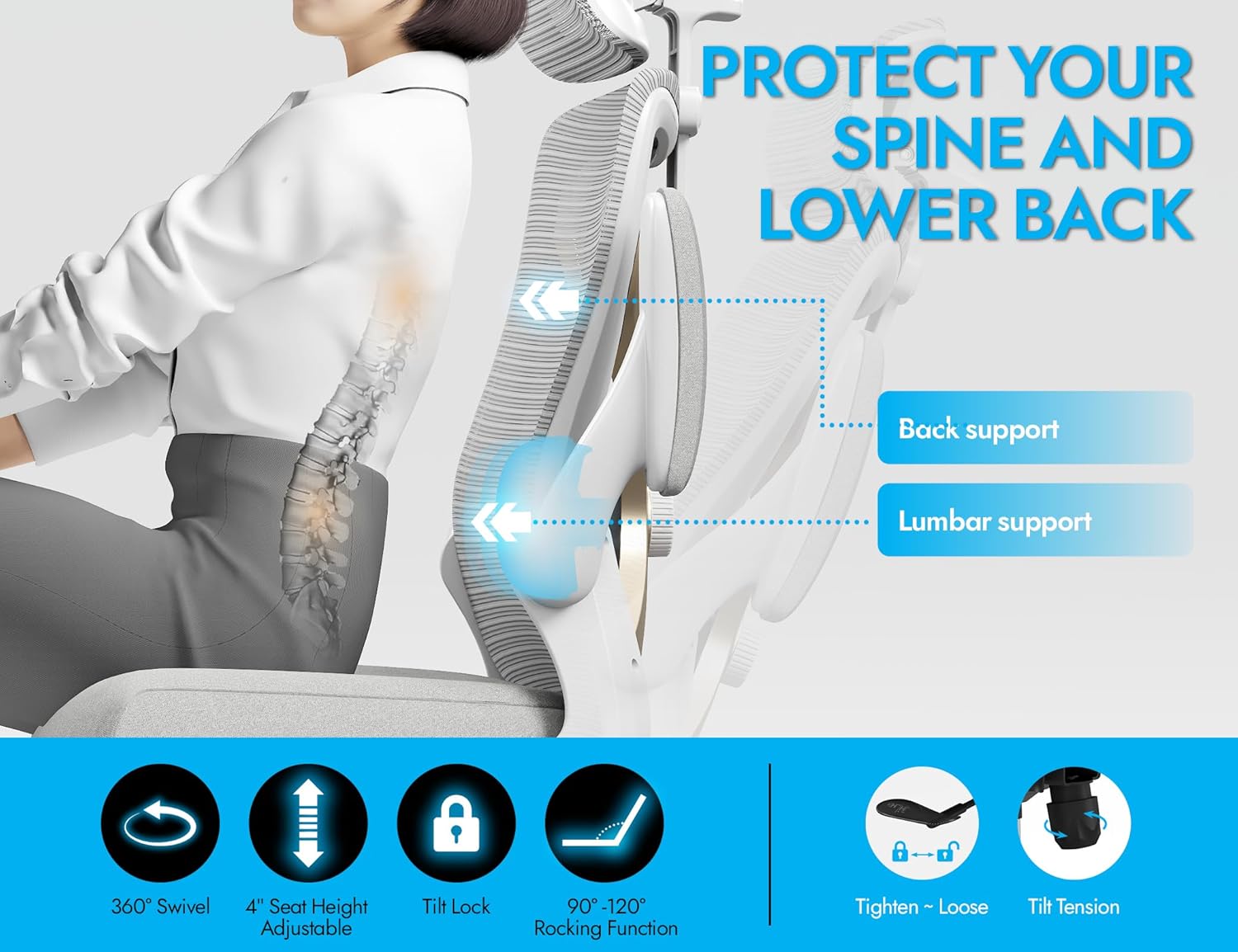 - Comfortable Breathable Mesh Seat: This office chair offers a spacious seating area, accommodating various body types. Overall dimensions (including arms): 25.7" W x 17.3" D x 46.9.3"-49.2" H, Seat dimensions: 20" W x 17.3" D x 18.5"-3" H. It can support up to 330 lbs. Its unique recline function allows you to tilt the backrest (90~120°) or sit upright freely, ensuring your comfort and relaxation