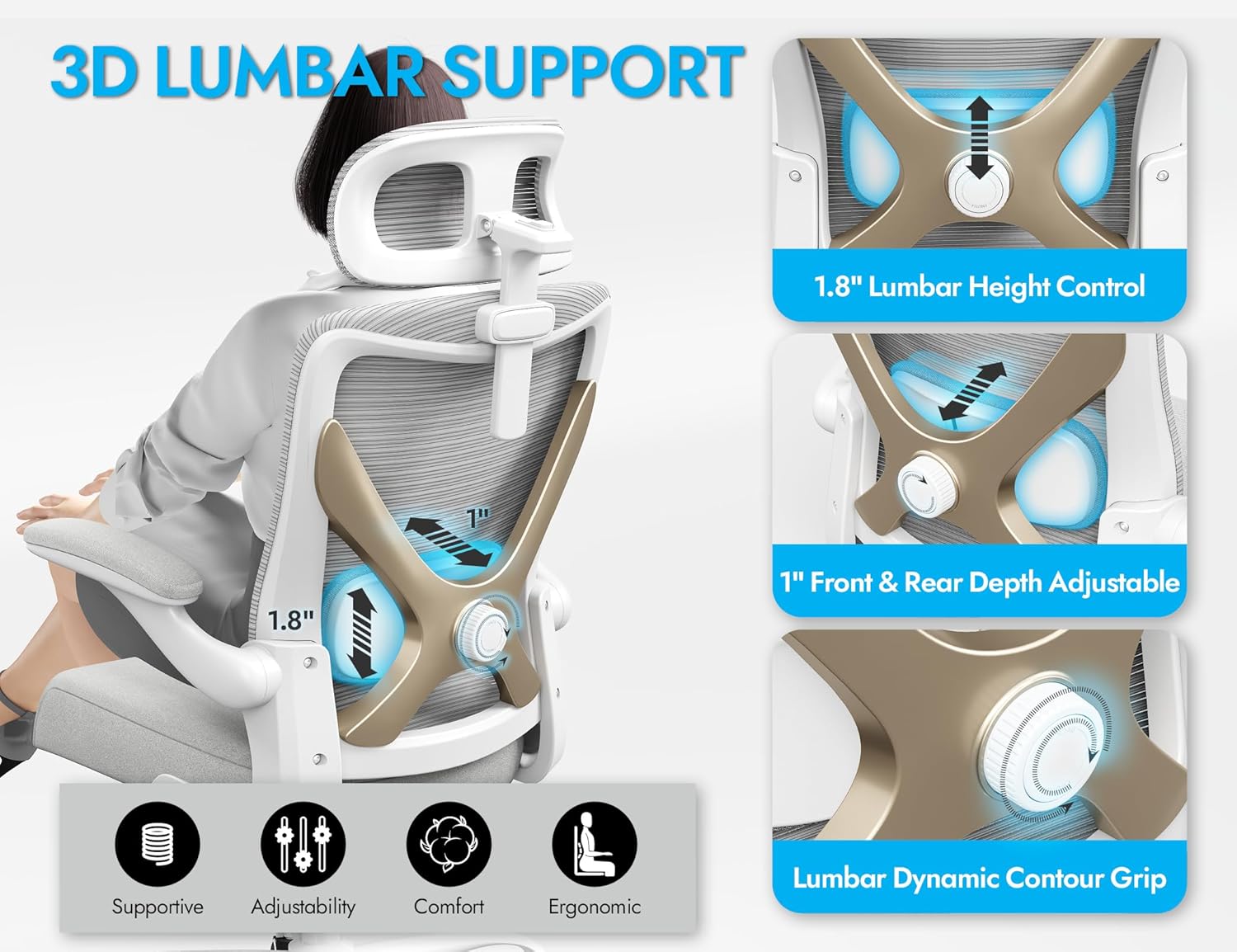 - Ergonomic Office Chair: Experience unparalleled support with our ergonomic office chair, designed to provide comprehensive assistance for your head, back, hips, and arms. Tailored lumbar support ensures your comfort and well-being. Suitable for people of about 5'5" to 6'2". Easily adjust seat height, headrest, backrest, and flip-up arms to cater to diverse needs, offering comfortable support during extended periods of sitting