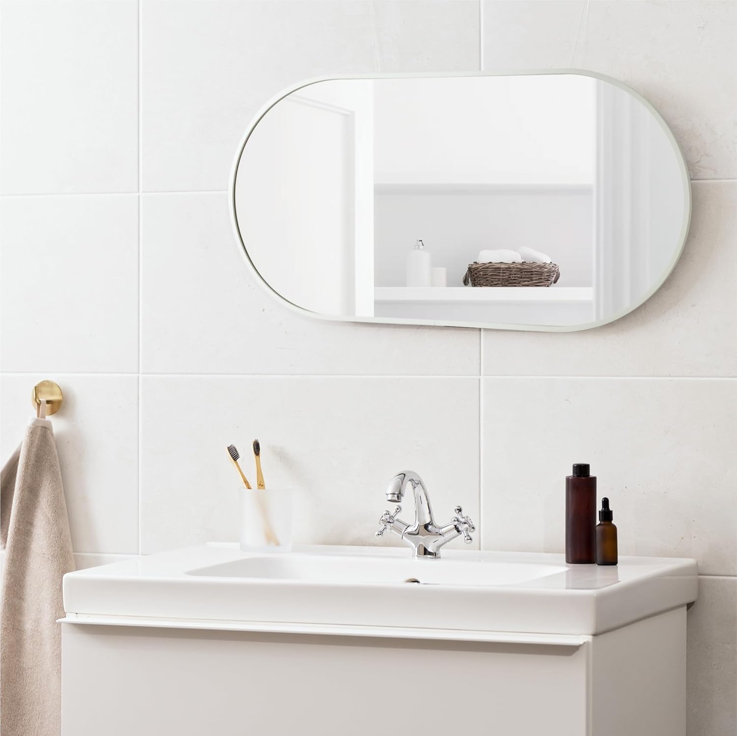 - TRENDY SHAPE: The mirror's metal frame has a chic white finish, providing an elegant surround for your reflection. Make a style statement instead of settling for a standard shape like a square, rectangular or round mirror.