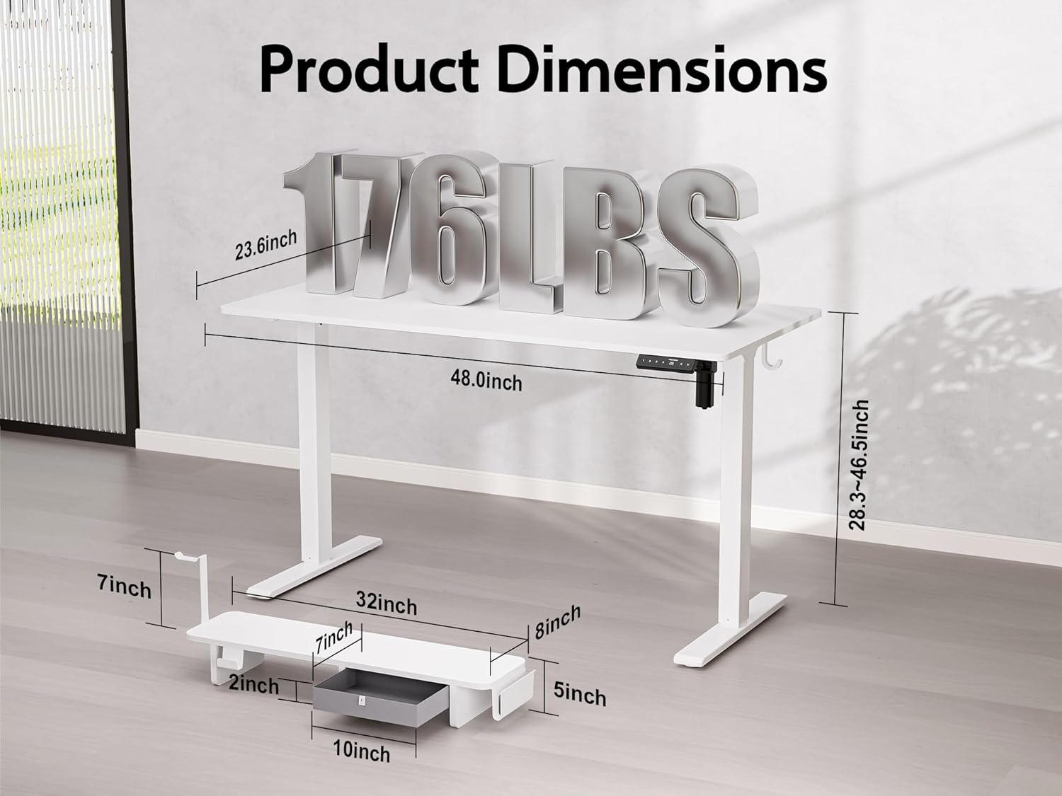 48x24 Inches Electric Standing Desk with Drawer and Monitor Stand, Height Adjustable Desk for Home Office, Ergonomic Sit to Stand with Phone Holder, 3 Hooks, White