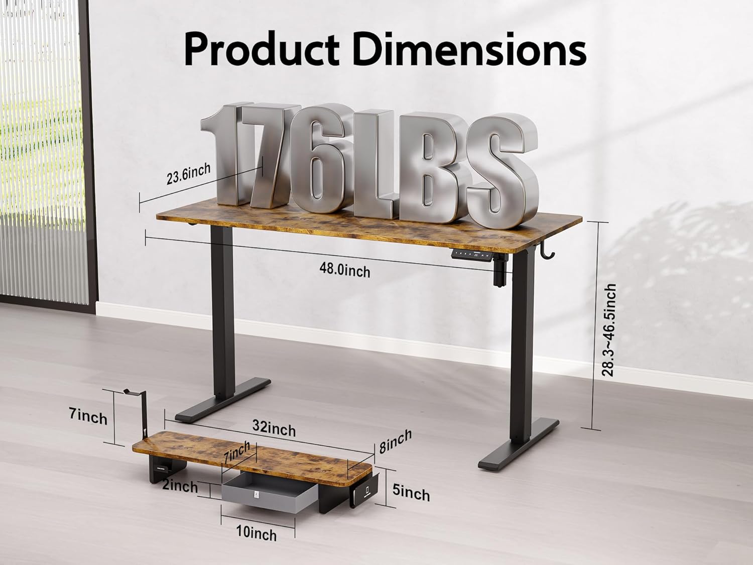 48x24 Inches Electric Standing Desk With Drawer and Monitor Stand, Height Adjustable for Home Office, Ergonomic Sit to Stand With Phone Holder, 3 Hooks, Rustic Brown