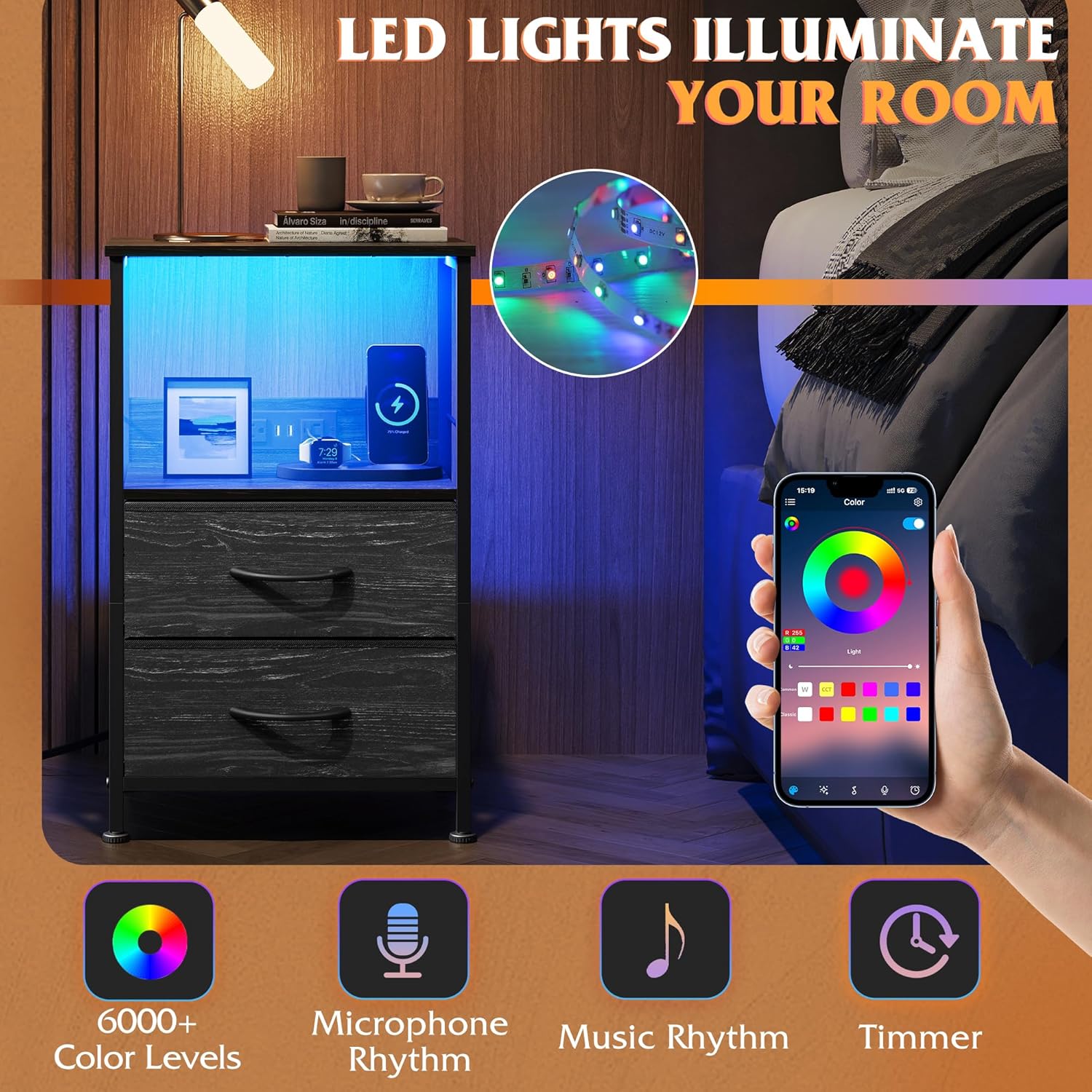 WLIVE Night Stand with Charger Station, LED Nightstand for Bedroom, Small Dresser with 2 Fabric Drawers for Small Spaces, Bed Side Table, Charcoal Black and Wood Grain Print