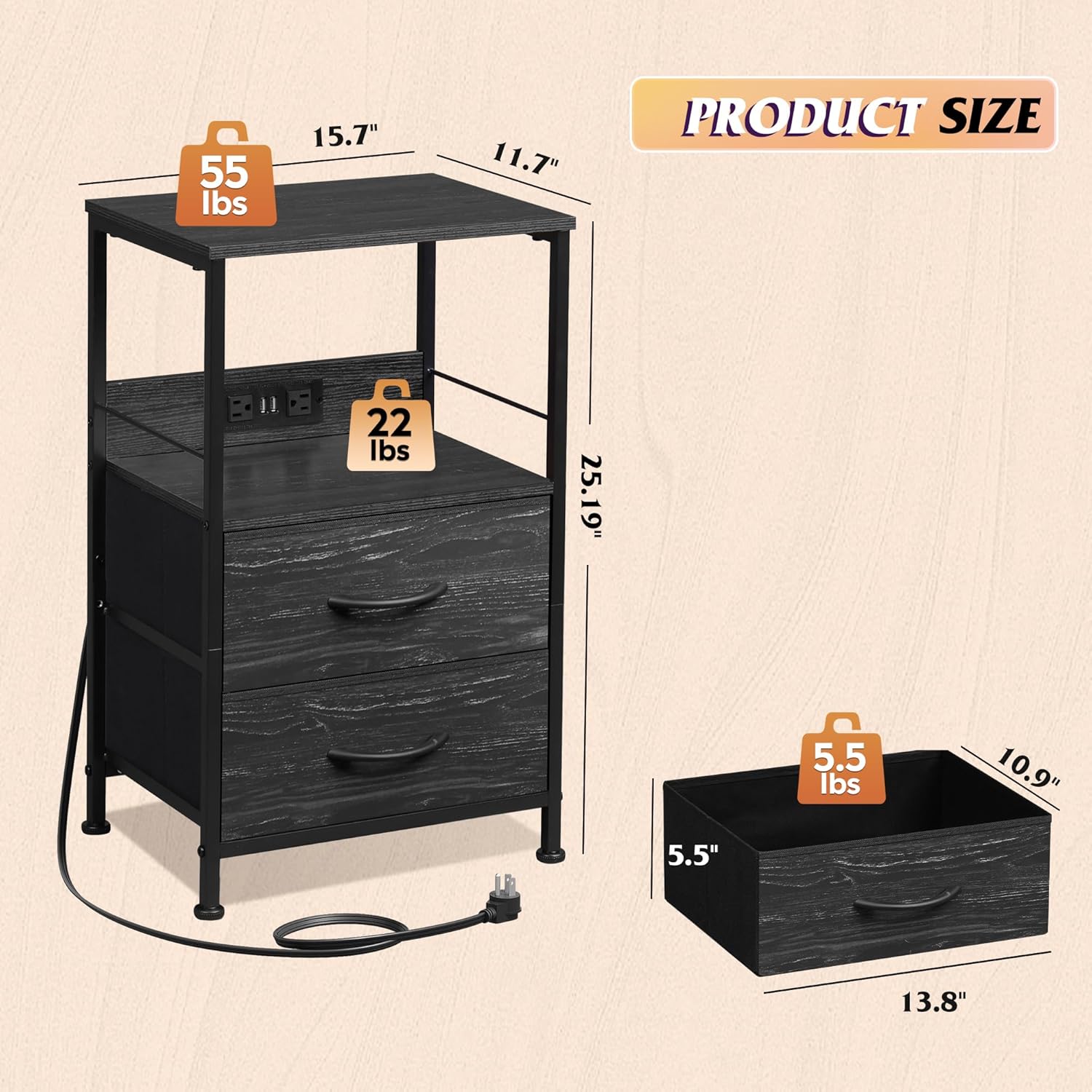 - [Spacious Storage] With 2 fabric drawers and an open wooden shelf, this bedroom dresser offers versatile storage solutions that balance open access with private storage. This bedside table measures 15.67"D x 11.73"W x 25.19"H, making it an excellent storage option for small spaces like dorm rooms and entryways. It is also suitable for various settings, such as bedrooms, living rooms, and offices, adding a cozy and organized touch to your home.