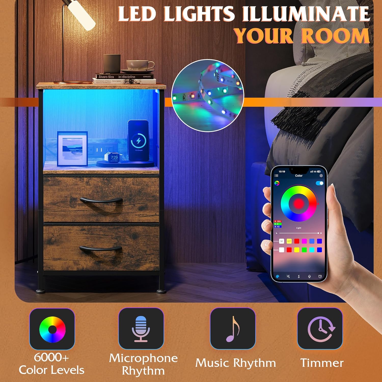 WLIVE Night Stand with Charging Station, LED Nightstand with 2 Fabric Drawers and Storage Shelf, Small Bedside Tables for Small Spaces, Dresser for Bedroom, Rustic Brown