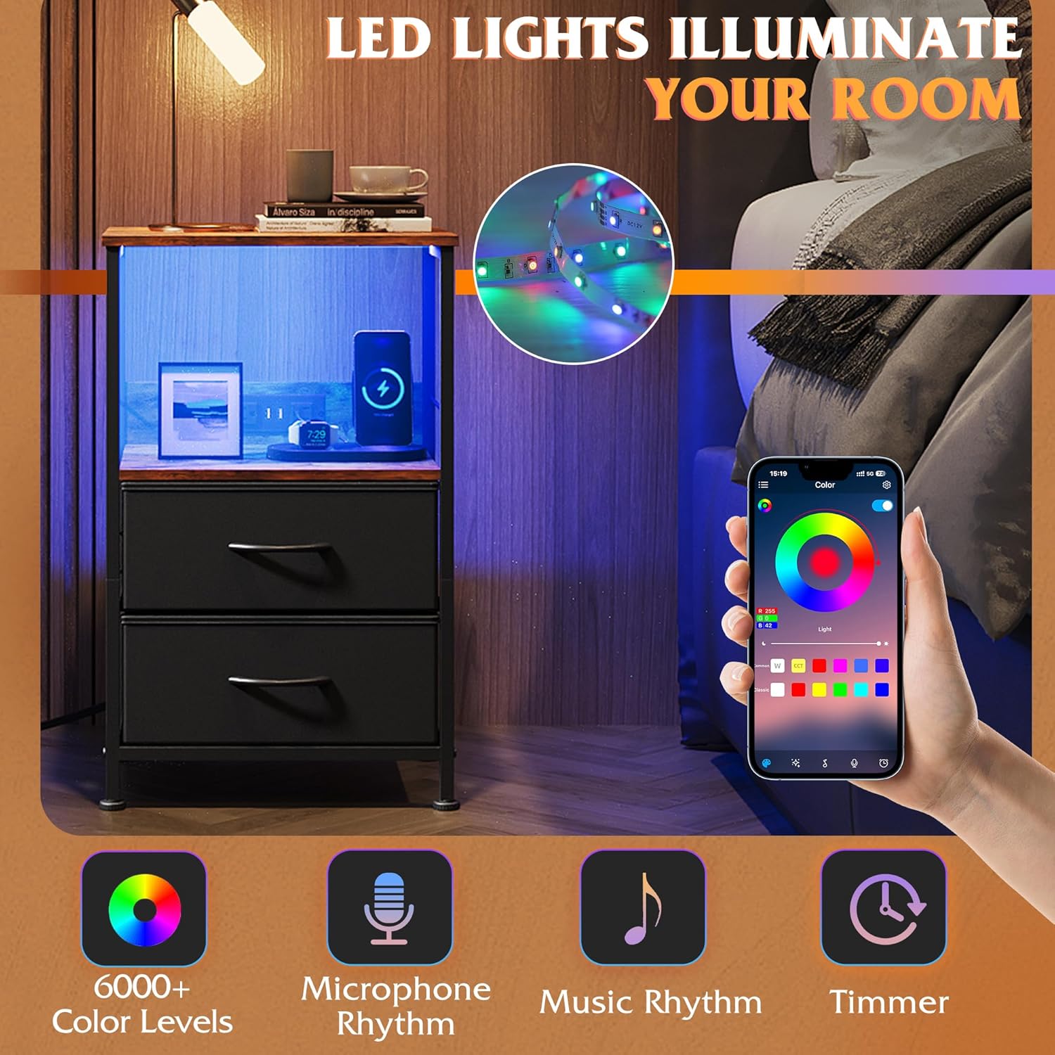 WLIVE Nightstand with Charging Station, LED Night Stand with 2 Fabric Drawers and Open Shelf, Small Dresser for Small Spaces, Side End Tables for Bedroom, Rustic Brown and Black