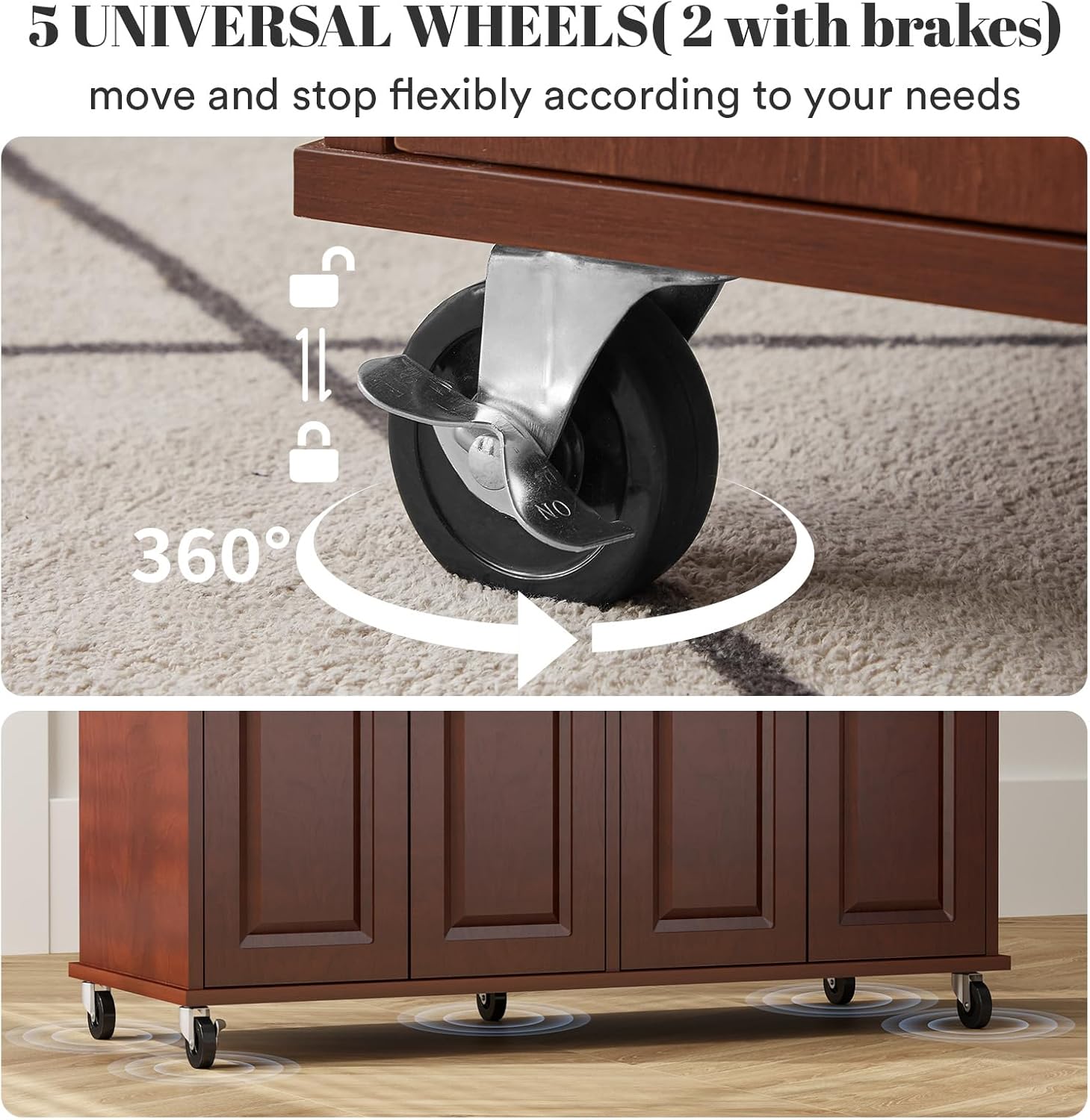 - 【KITCHEN ISLAND ON WHEELS】The bottom of the mobile kitchen island has 5 universal wheels( 2 with brakes), so it can move and stop flexibly as you need, and go anywhere according to your space requirements.