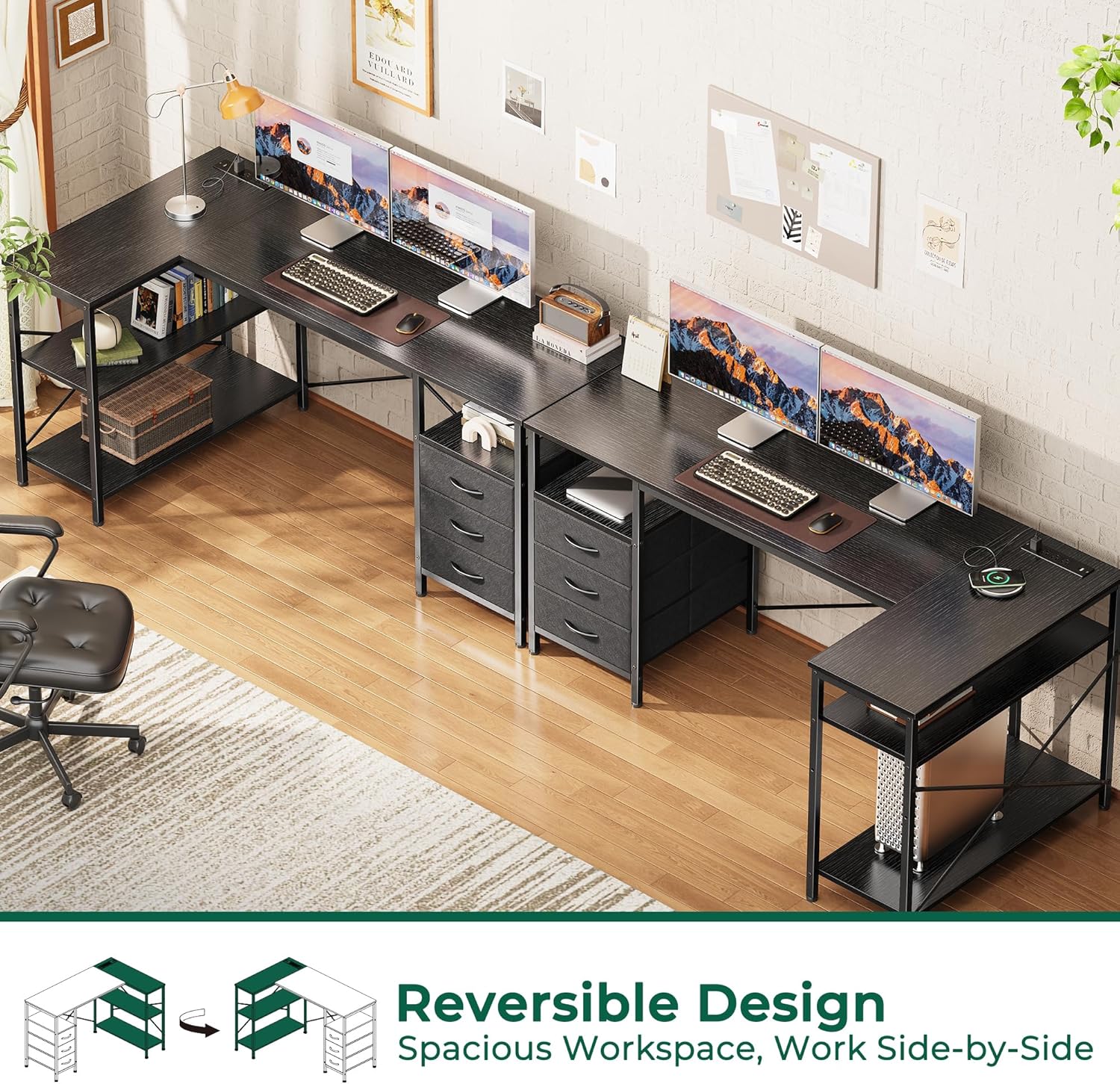 Huuger L Shaped Office Desk with Power Outlets, 55 Inch Computer Desk with 3 Drawers, Shelves, Reverisble for Gaming Corner Work Home Office Study, Black