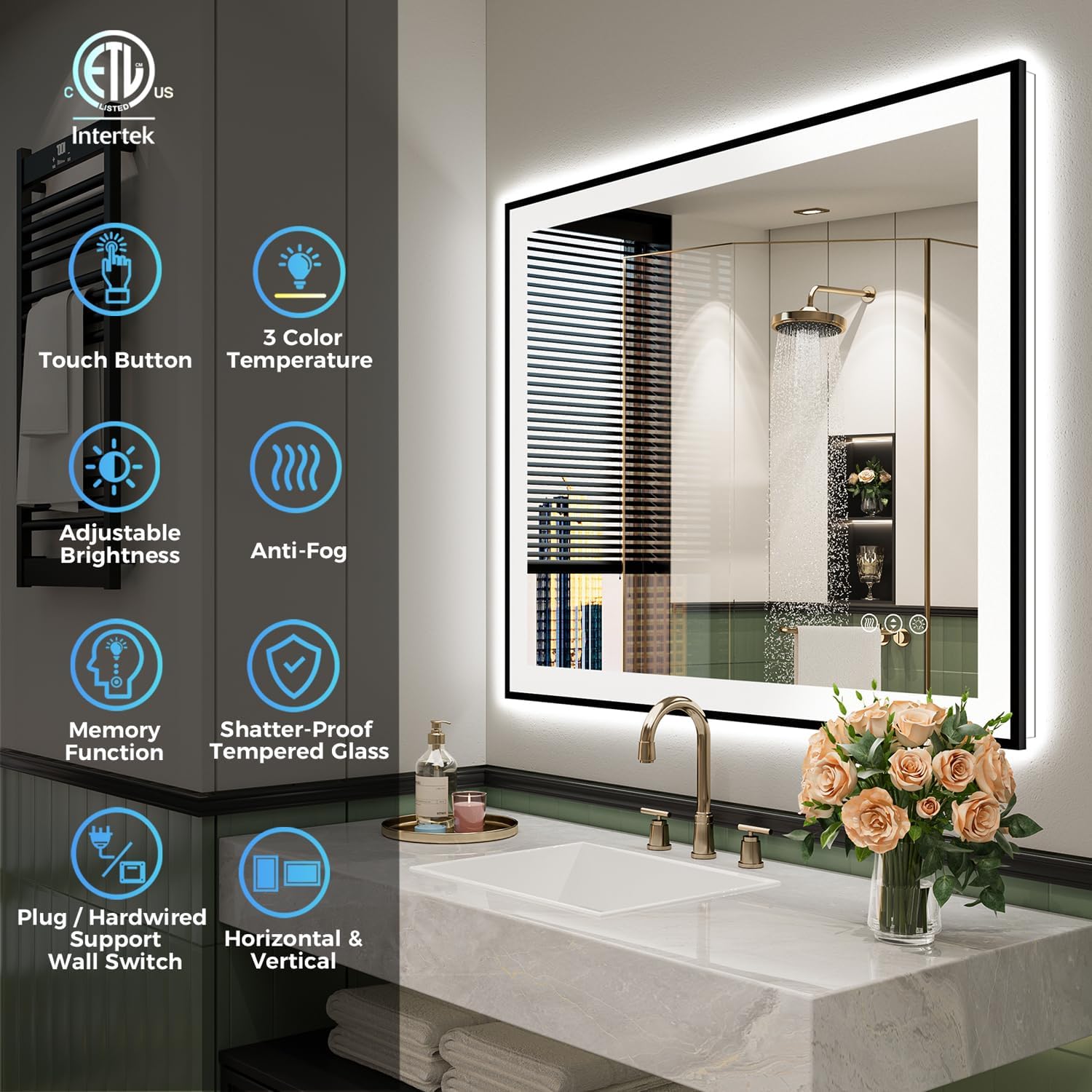 - 🔆【Backlit+Front Lit & Black Frame】- Designed with double lighting, our Led mirror for bathroom is twice or more brighter than ordinary lighted bathroom mirror. Bright enough for makeup, shaving or beauty care. The modern look of black frame is perfect for you to remodel and upgrade bathroom.