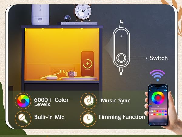 - [LED Nightstand] Enhance your bedroom with this night stand featuring a colorful LED light strip. You can control the color changes and turn the lights on or off using your phone's app and key control. The brightness of the bedside table is adjustable, allowing you to create a soothing atmosphere that helps you relax and drift off to sleep peacefully.