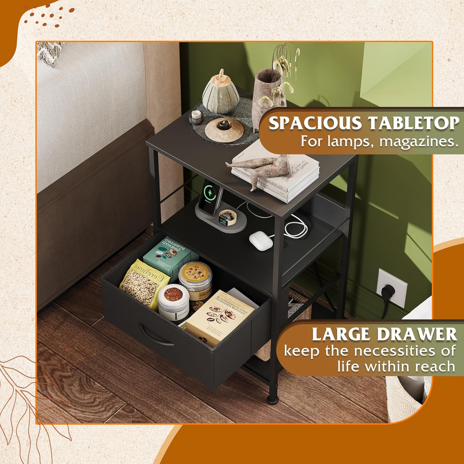 - [Spacious Storage] This black nightstand includes 1 fabric drawer that provide ample storage while maintaining your privacy. The open shelves are perfect for displaying a lamp or books, adding a decorative touch to your room. With this functional bedroom furniture and charging station, you'll keep your essentials within easy reach.