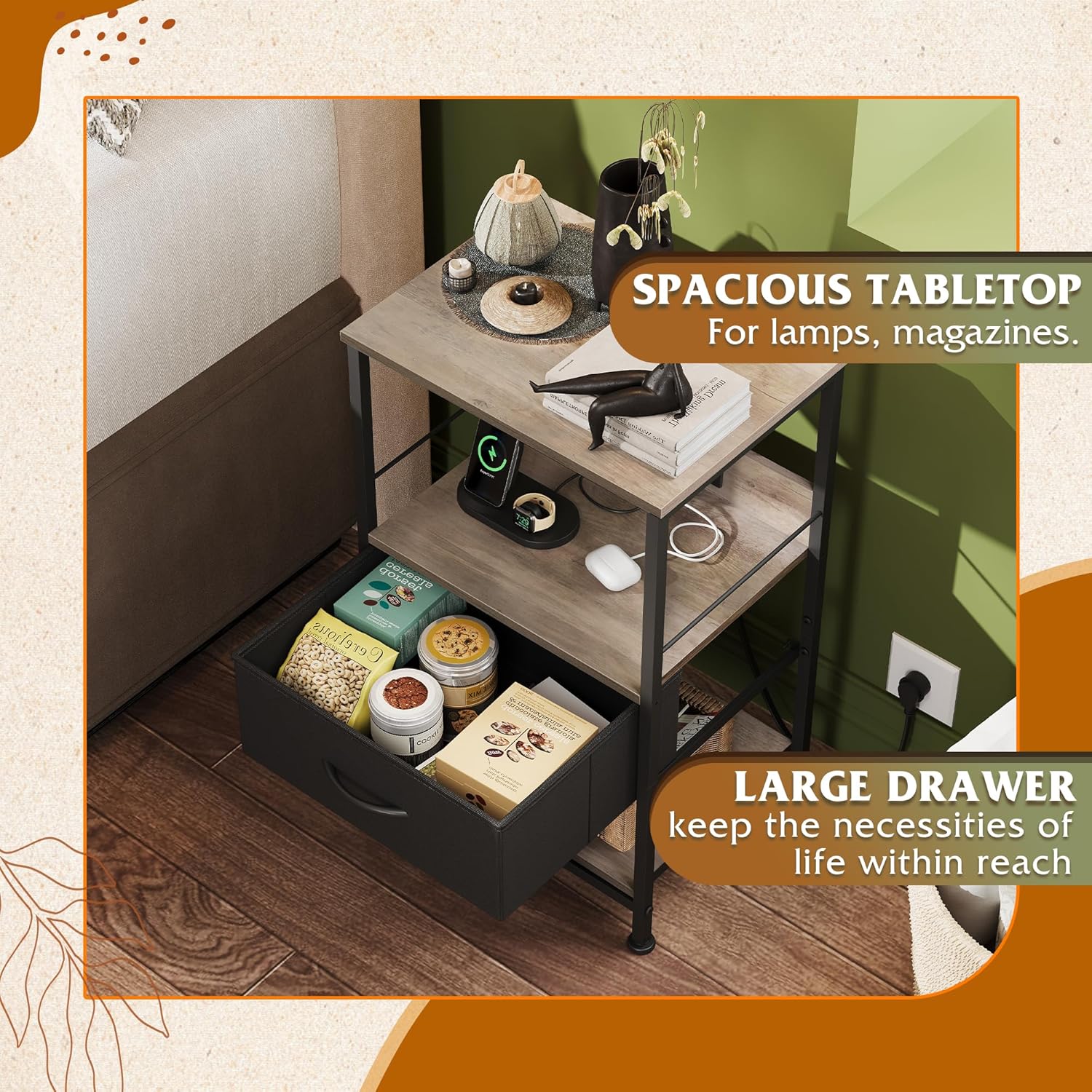 - [Spacious Storage] This greige nightstand includes 1 fabric drawer that provide ample storage while maintaining your privacy. The open shelves are perfect for displaying a lamp or books, adding a decorative touch to your room. With this functional bedroom furniture and charging station, you'll keep your essentials within easy reach.