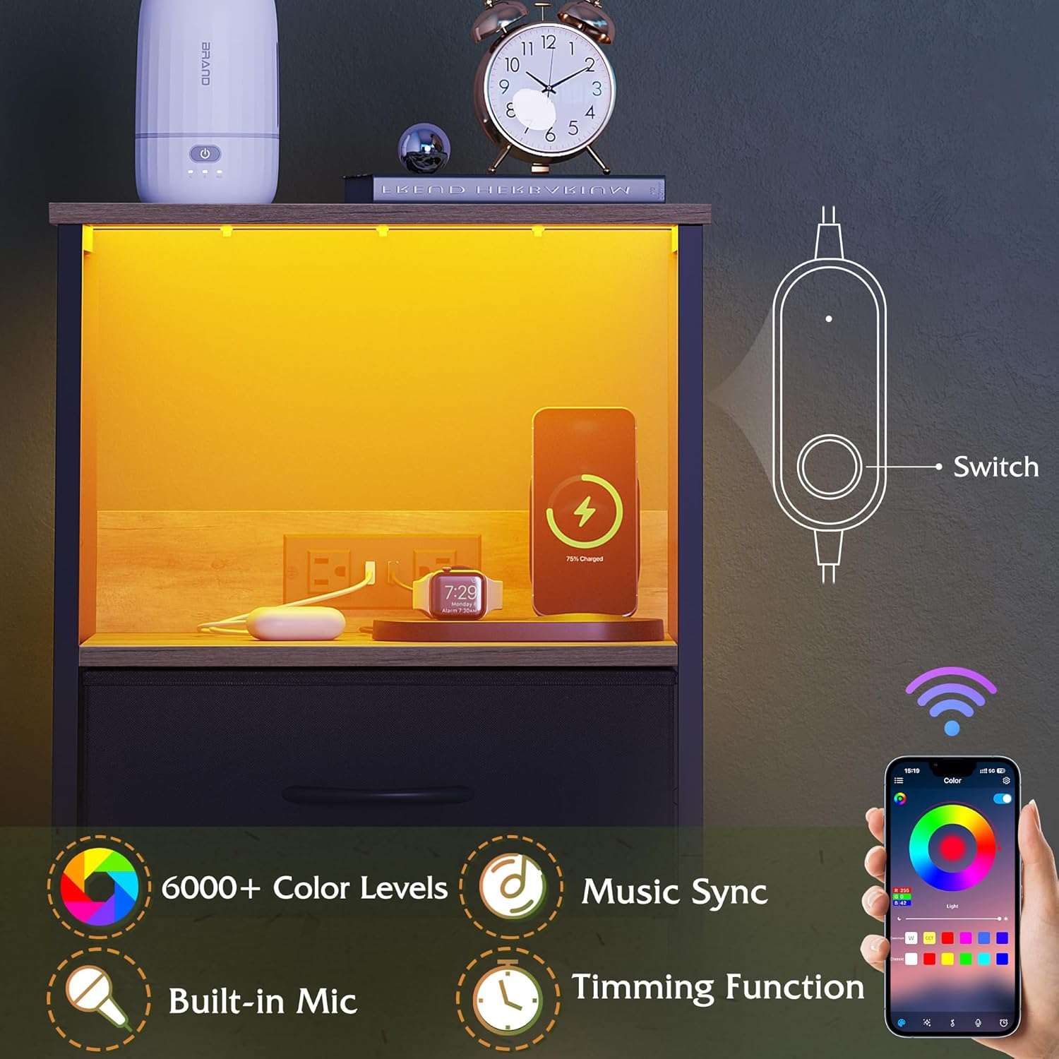 - [LED Nightstand] Enhance your bedroom with this night stand featuring a colorful LED light strip. You can control the color changes and turn the lights on or off using your phone's app and key control. The brightness of the bedside table is adjustable, allowing you to create a soothing atmosphere that helps you relax and drift off to sleep peacefully.