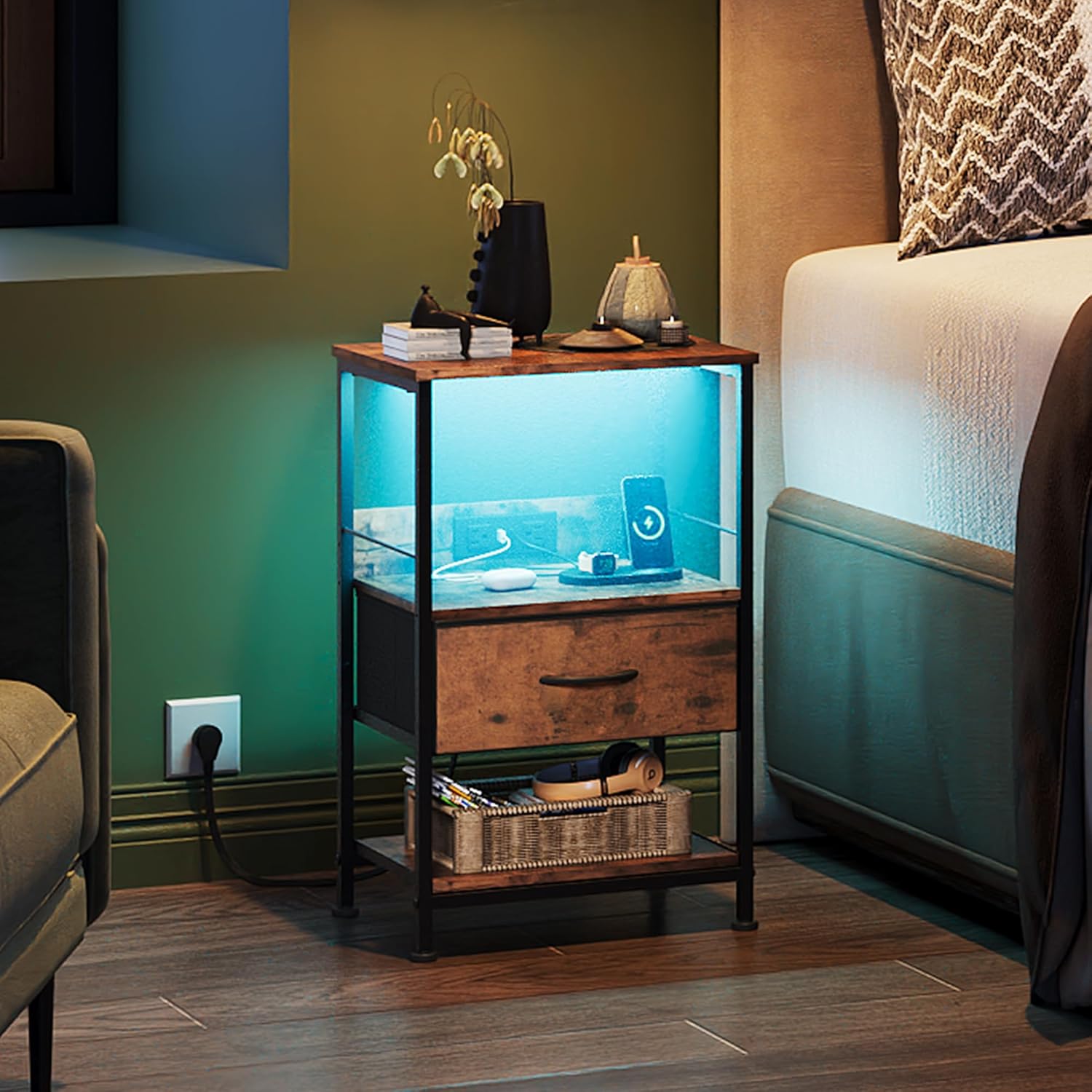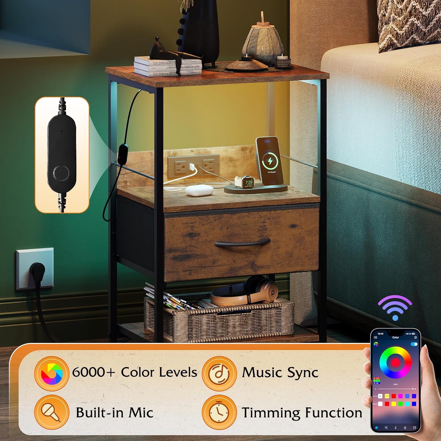 - [Night Stand with Charger Station] This tall nightstand packs a punch with 3 USB ports and 2 AC outlets, so you can charge your smartphone and iPad all at once. No more hunting for charging ports! Plus, it has dedicated spots for LED light strips. The end table's built-in power design also keeps spills at bay, ensuring safety during everyday use.
