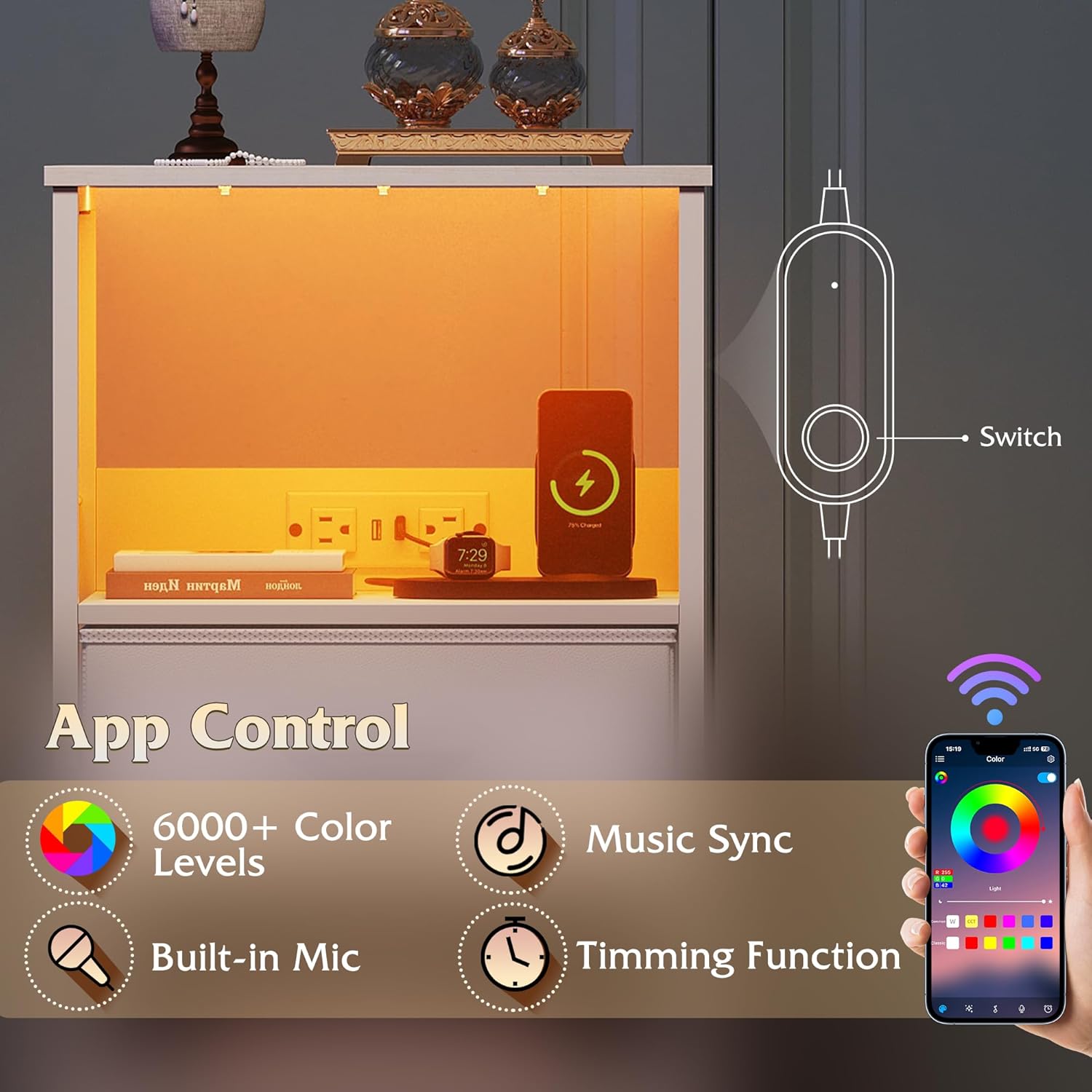 - [LED Nightstand] Enhance your bedroom with this night stand featuring a colorful LED light strip. You can control the color changes and turn the lights on or off using your phone's app and key control. The brightness of the bedside table is adjustable, allowing you to create a soothing atmosphere that helps you relax and drift off to sleep peacefully.
