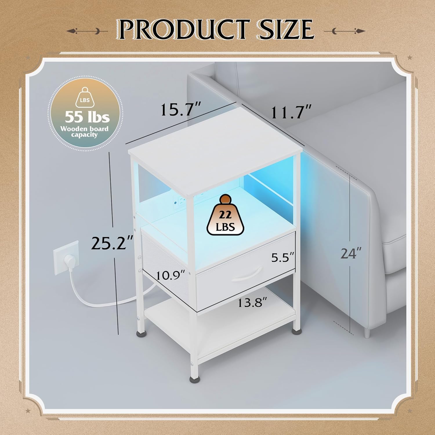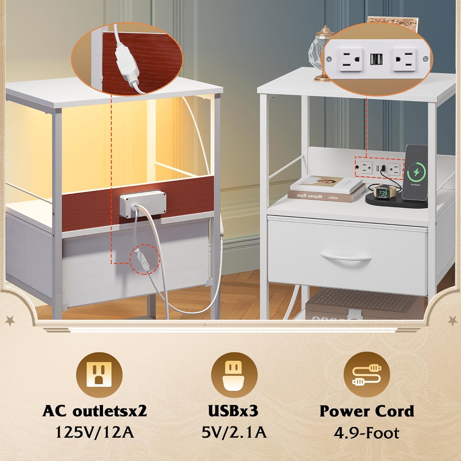 - [Night Stand with Charger Station] This tall nightstand packs a punch with 3 USB ports and 2 AC outlets, so you can charge your smartphone and iPad all at once. No more hunting for charging ports! Plus, it has dedicated spots for LED light strips. The end table's built-in power design also keeps spills at bay, ensuring safety during everyday use.
