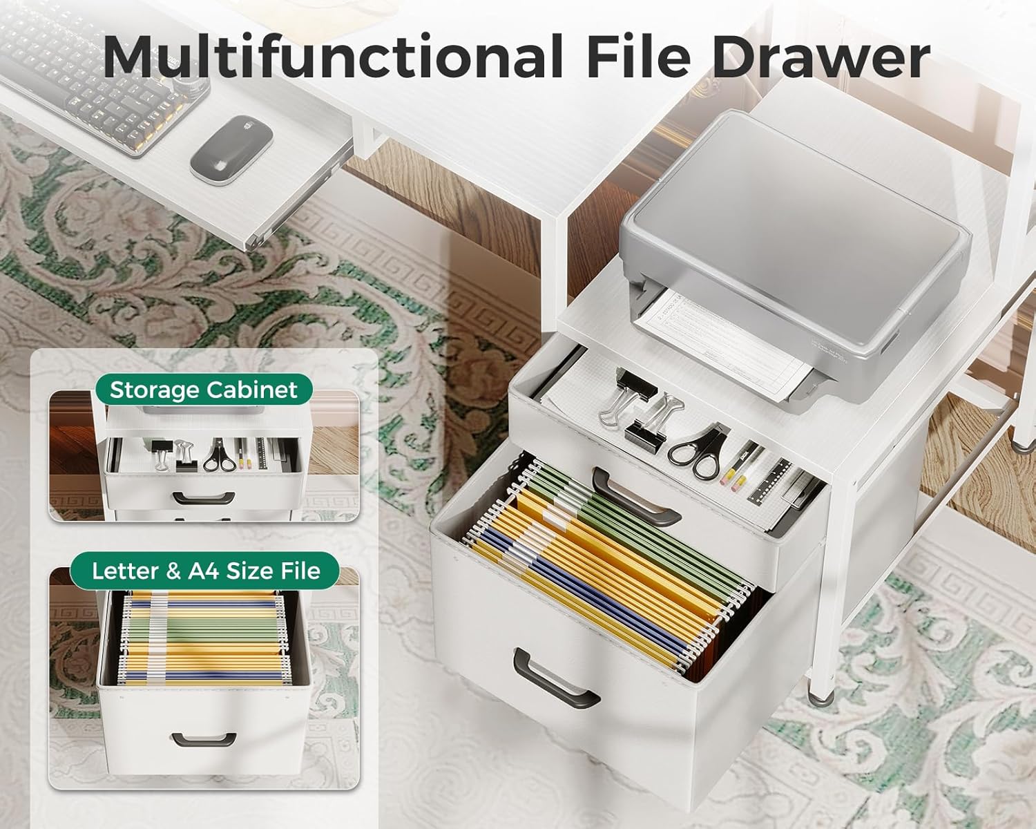 - 【Fabric File Cabinet and Printer Shelf】This desk features a fabric file cabinet (fits letter/A4/legal files) and a fabric drawer. The drawers are ready to use, easy to clean, and offer private storage. The side shelf fits most printers or can hold office supplies, keeping them within easy reach of your desk